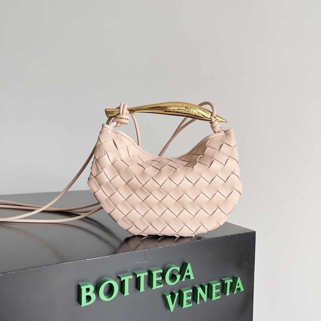 This is a replica BOTTEGA VENETA Sardine Intrecciato Leather Baby Bag in Lotus. This ‘Sardine’ shoulder bag is braided from strips of supple calf leather and hangs from a sculptural gold-tone top handle.,
