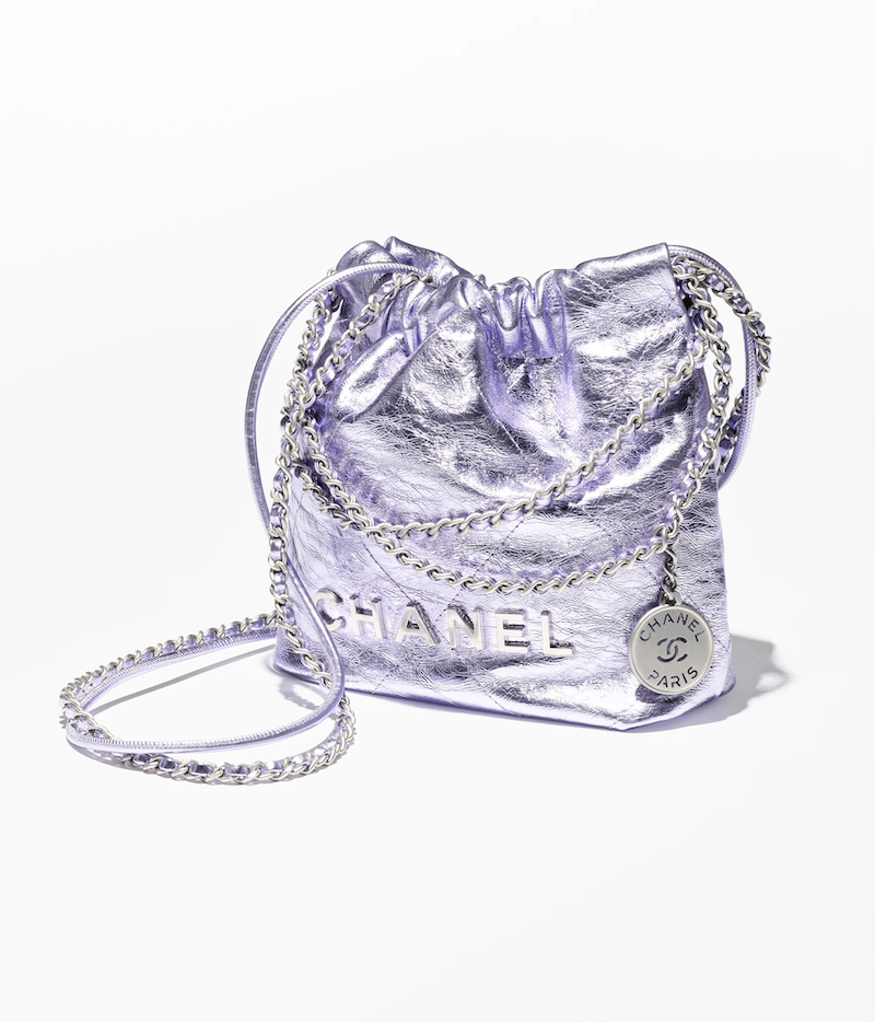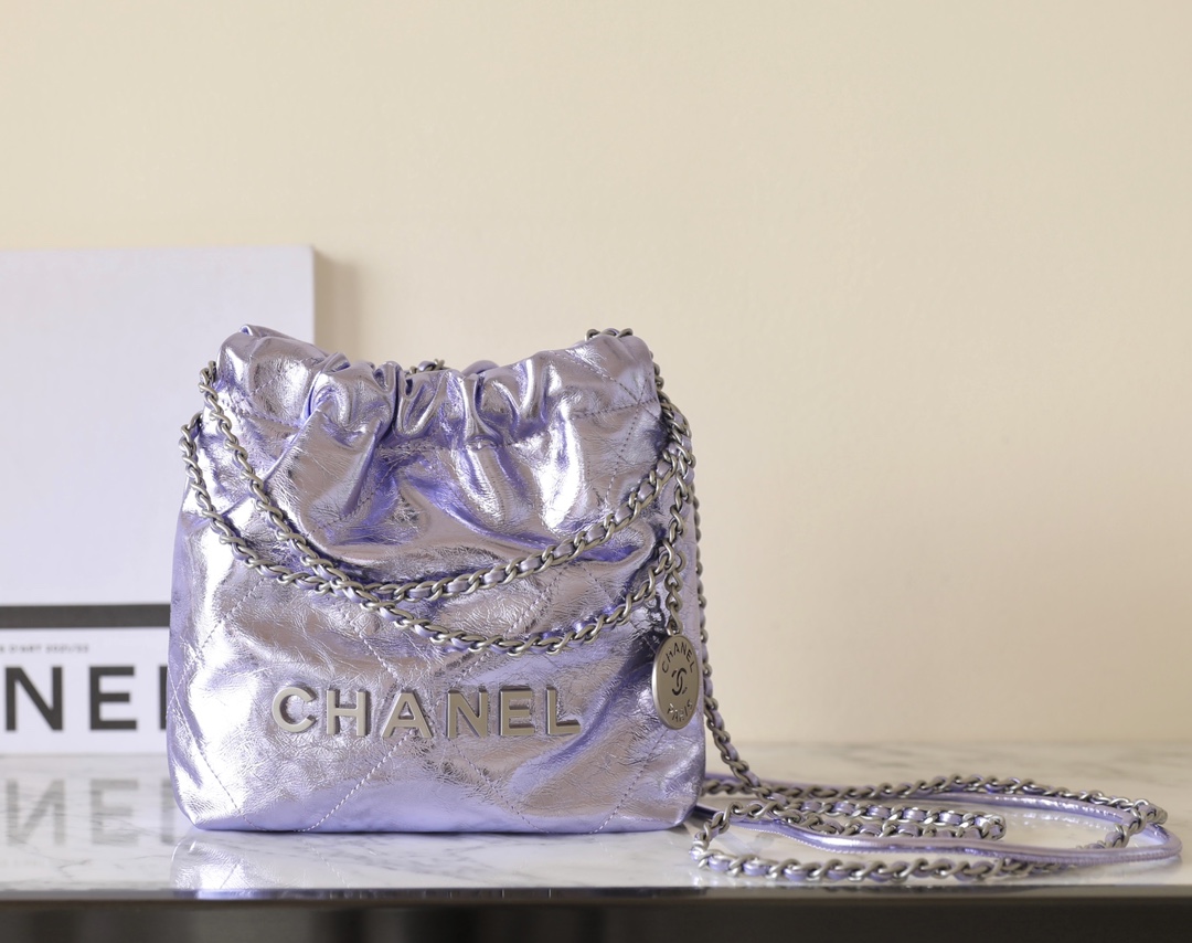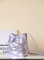 This is a replica CHANEL 22 Mini Handbag Metallic Calfskin & Silver-Tone Metal Lilac. From the Cruise 2025 Collection by Virginie Viard, this mini 22 bag comes in metal lilac,Size,