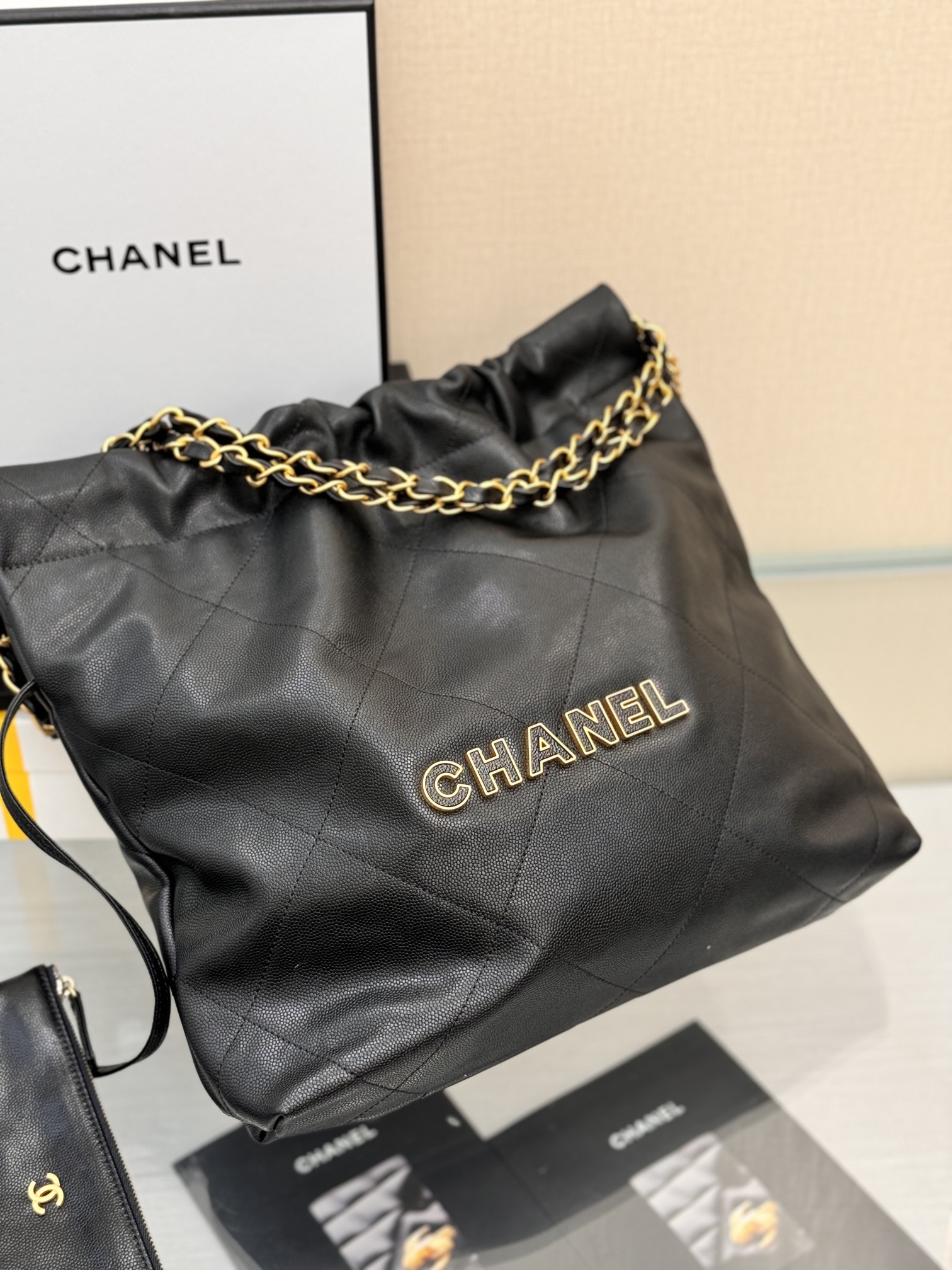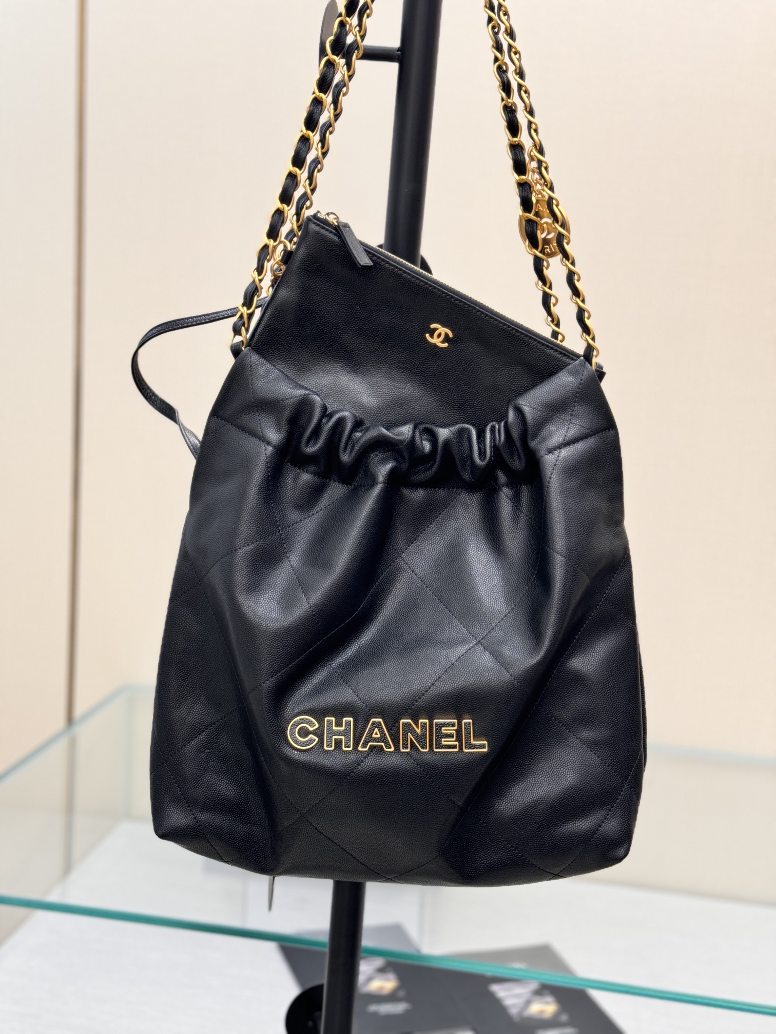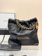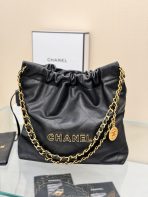 This is a replica CHANEL 22 Small Handbag Shiny Calfskin & Gold-Tone Metal in Black. From the Cruise 2025 Collection by Virginie Viard, this small 22 bag comes in shiny calfskin,,Size: Small ,
