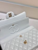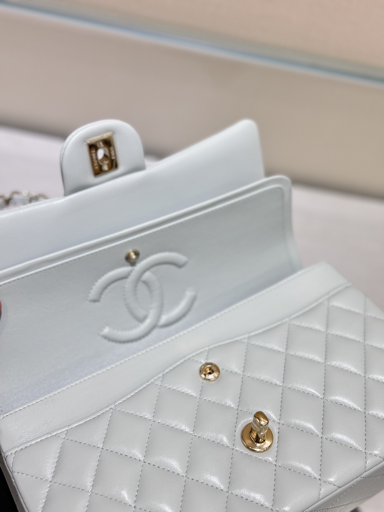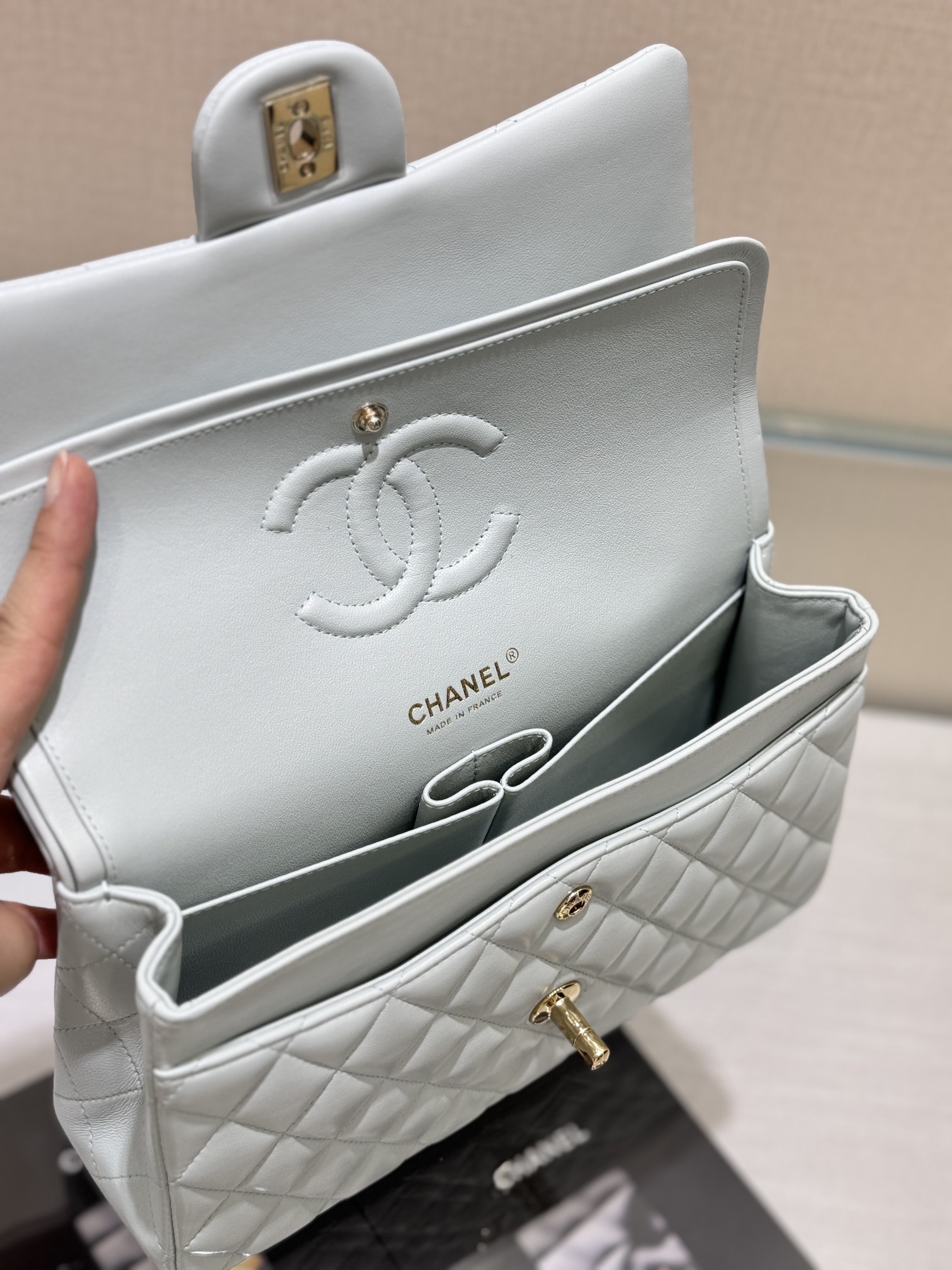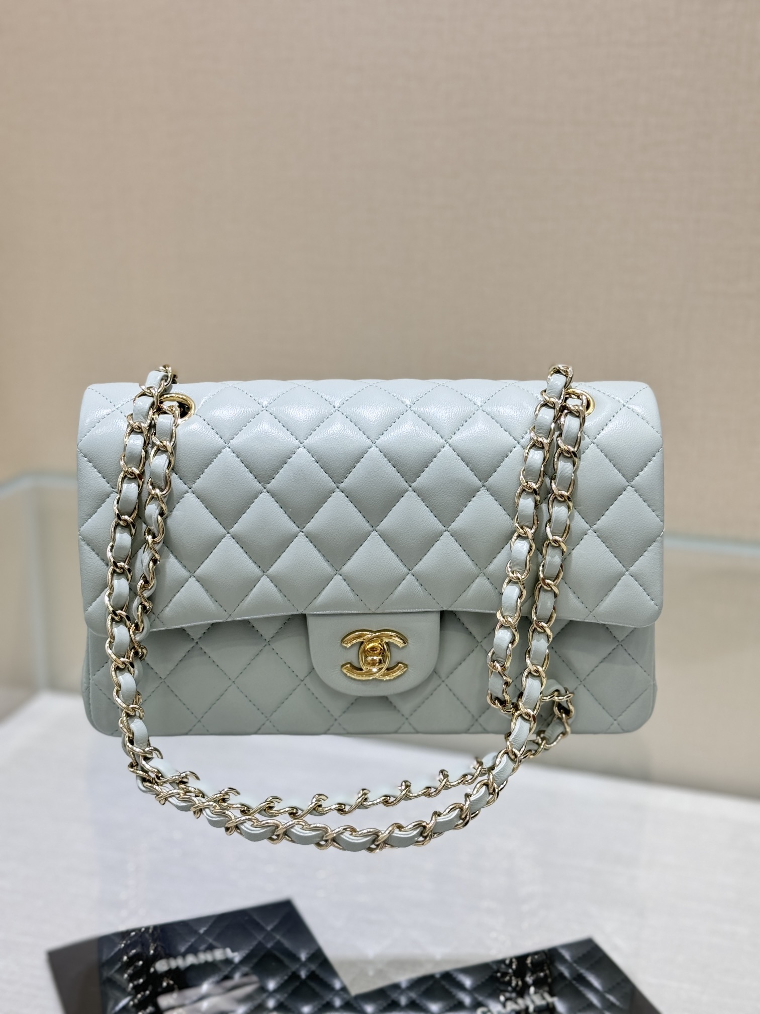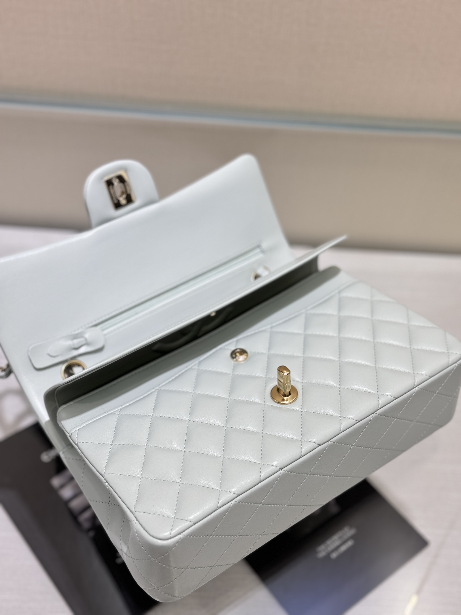 This is a replica CHANEL Classic 11.12 Flap Bag Lambskin & Gold-Tone Metal in Light blue. This classic double flap bag comes in smooth light blue lambskin featuring gold-tone hardware. Open pocket on the back. Closes with classic CC-turn-lock on the front. Zipper pocket inside the flap. Outside pocket on the front under the flap. A lipstick pocket against the back. CC stitching on the inside flap. ,Size,