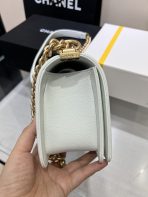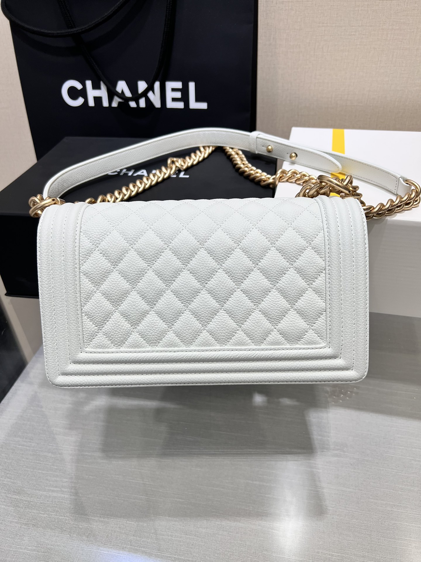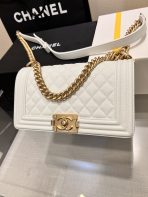 This is a replica CHANEL Classic Boy Flap Calfskin & oG Metal in White. This small boy flap bag comes in caviar black caviar calfskin featuring gold-tone hardware. Grosgrain Lining & Single Interior Pocket. ,Size: Classic,