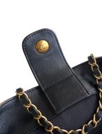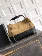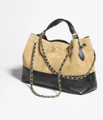 This is a replica CHANEL M¨¦tiers d’art Shopping Bag in beige suede calfskin and black shiny lambskin.  Material: Beige Suede Calfskin and Black Shiny Lambskin 24¡Á36¡Á14cm