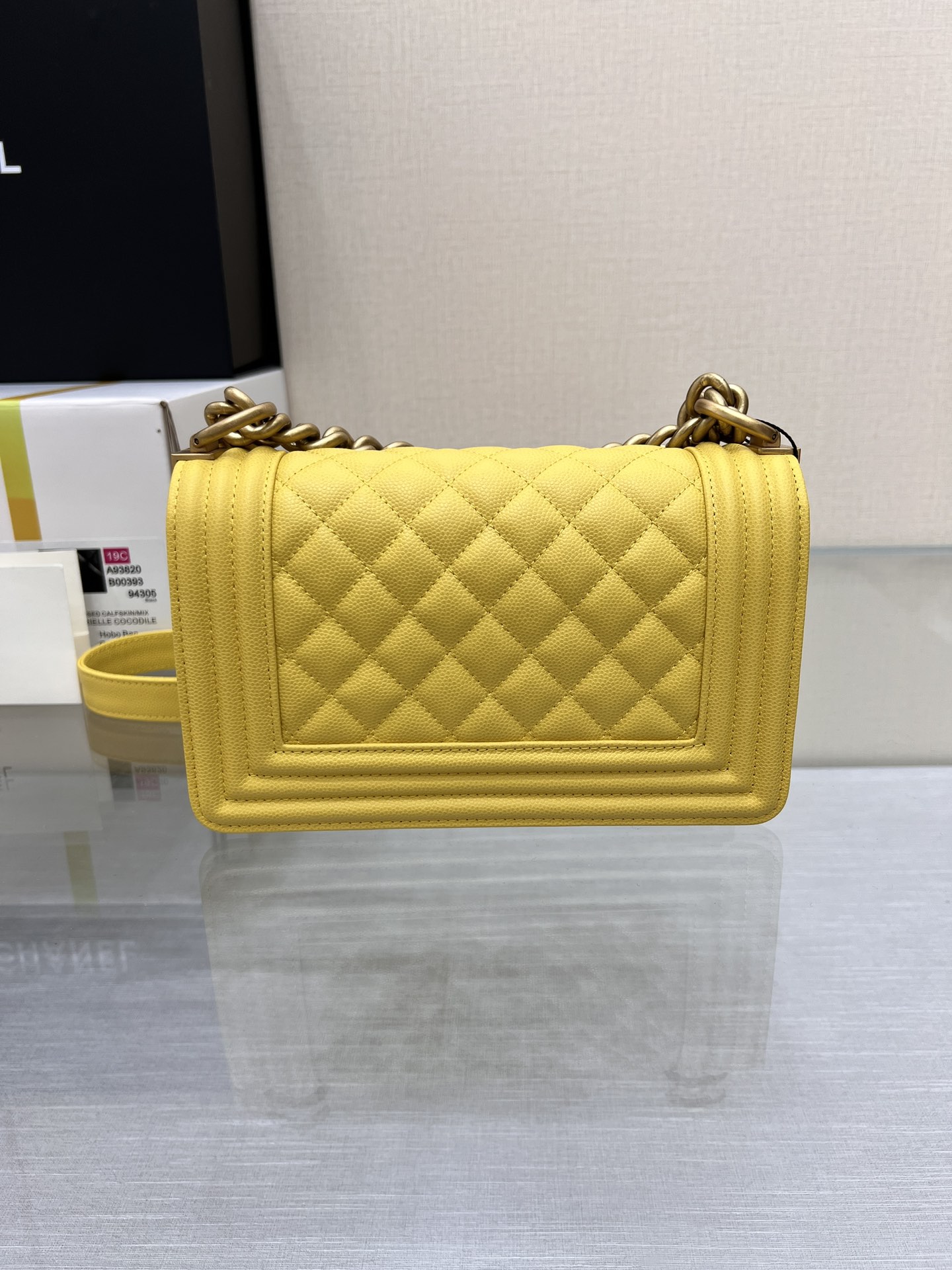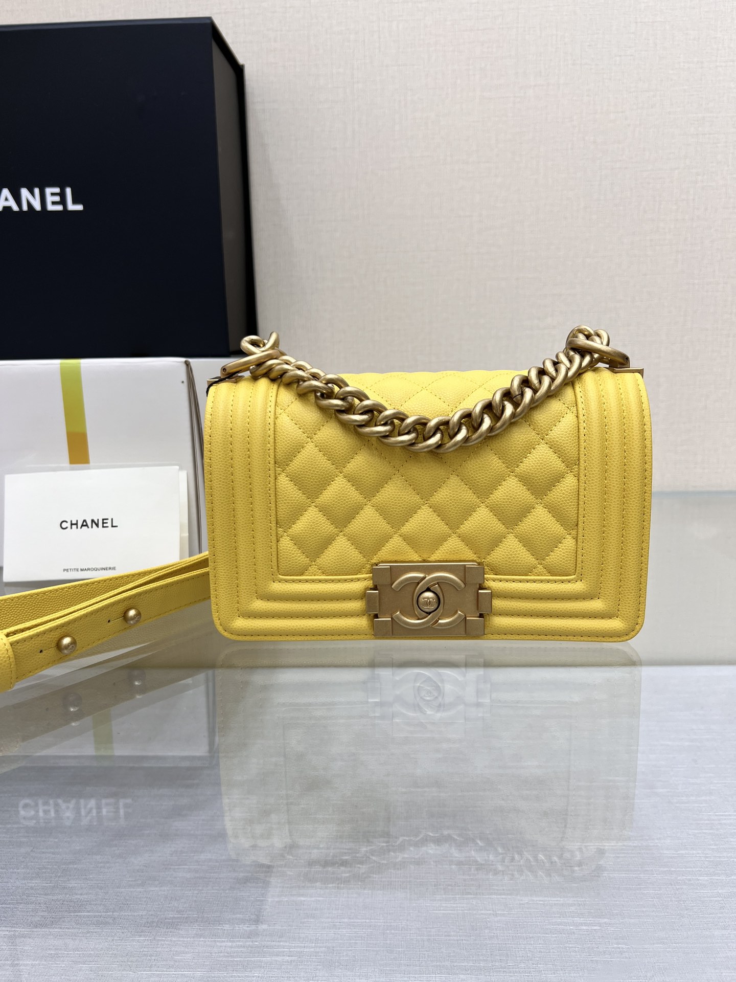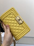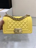 This is a replica CHANEL Small Boy Flap Calfskin & Ruthenium-Finish Metal in Yellow. This small boy flap bag comes in caviar black caviar calfskin featuring ruthenium-finish hardware. Grosgrain Lining & Single Interior Pocket. ,Size: Small,