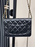 This is a replica CHANEL Wallet on Chain Shiny Lambskin, Enamel & Gold-Tone Metal in Black . The bag features an aged gold chain link leather threaded shoulder strap with a white enameled CC length adjuster, and a facing aged gold and black enamel CC turn lock.