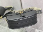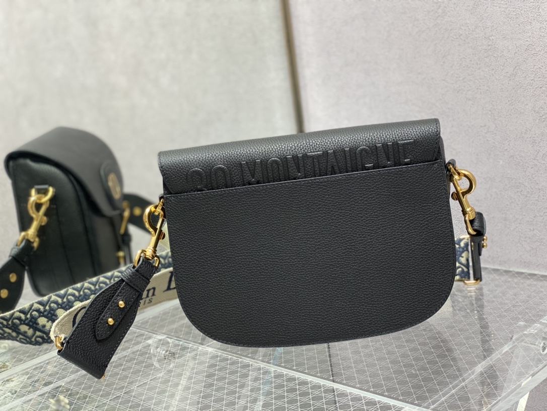 This is a replica CHRISTIAN DIOR Saddle Bag with Strap in black. This bag is finely crafted of grained calfskin. The bag features a rear pocket, a magnetic clasp and polished gold hardware. The flap opens to a black fabric interior with a patch pocket.,