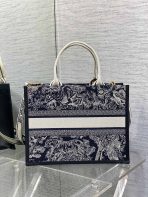 This is a replica CHRISTIAN DIOR Medium Dior Book Tote in Blue and Ecru Toile de Jouy Reverse Embroidery with Blue Calfskin. Main composition of t, cotton and calfskin. ,