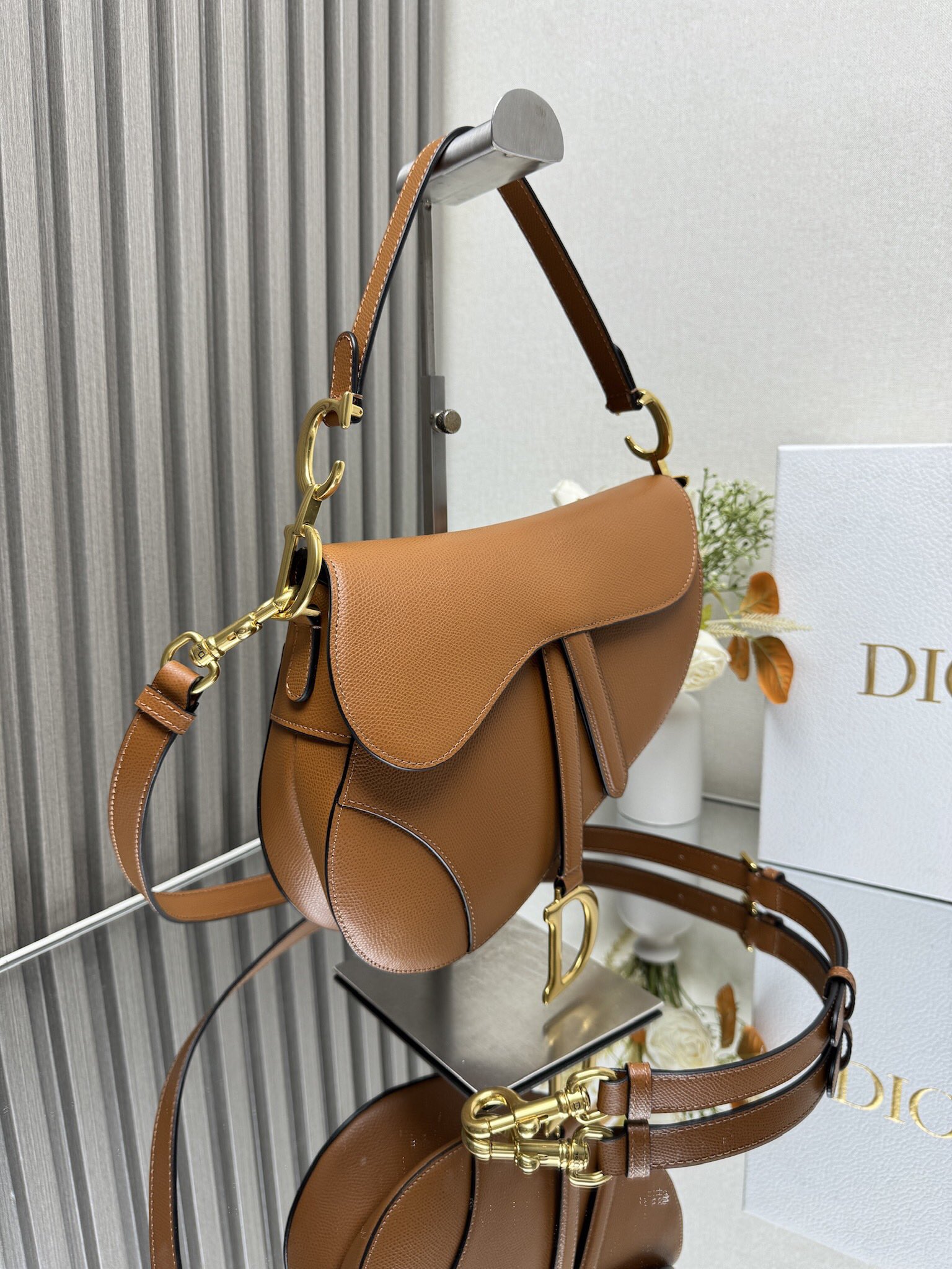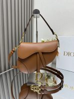 This is a replica CHRISTIAN DIOR Saddle Bag with Strap in golden. Main composition: grained calfskin. ,Size,