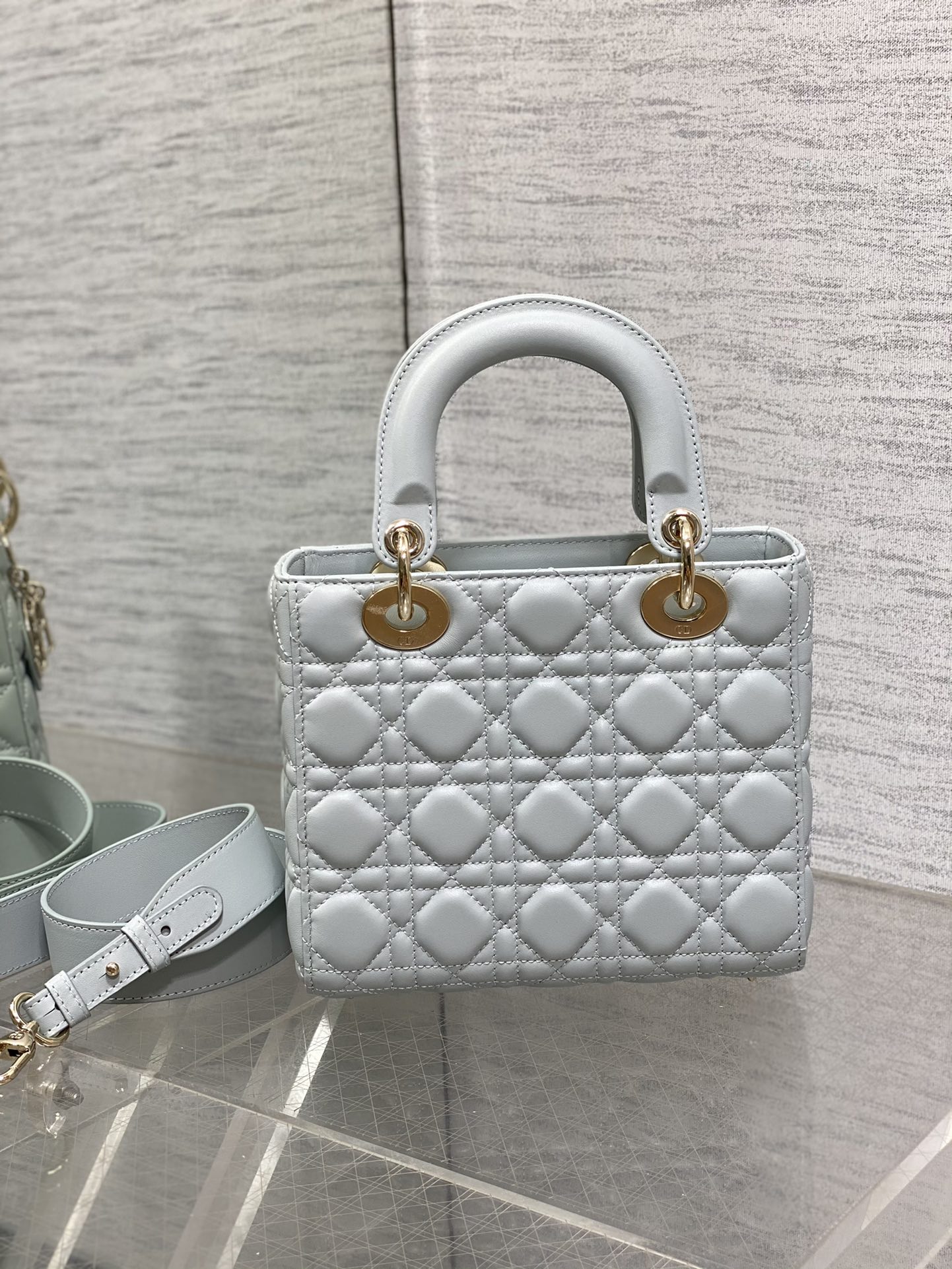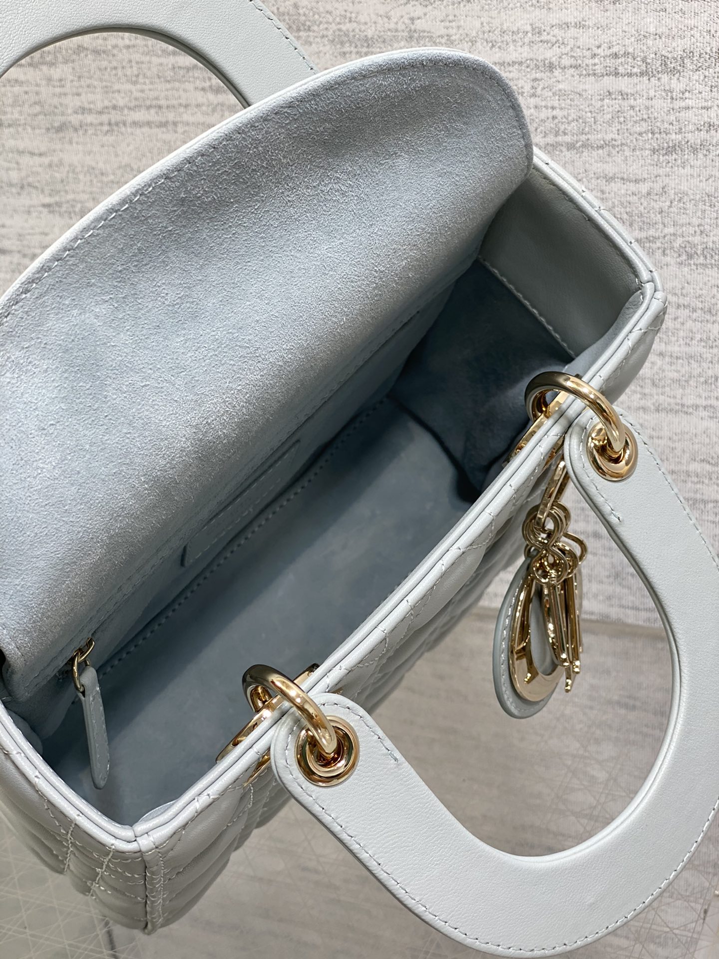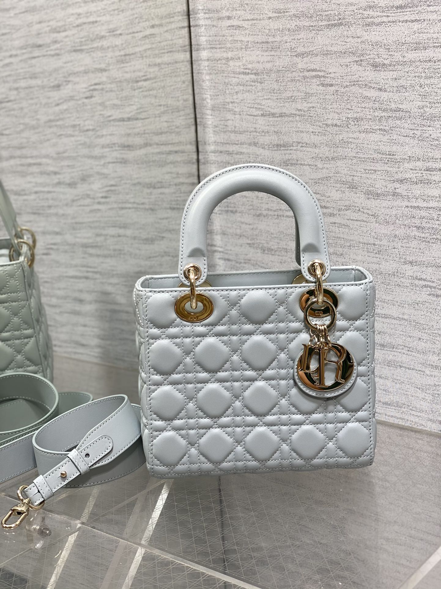This is a replica CHRISTIAN DIOR Mini Lady Dior Bag in pale blue. Main composition: lambskin. ,