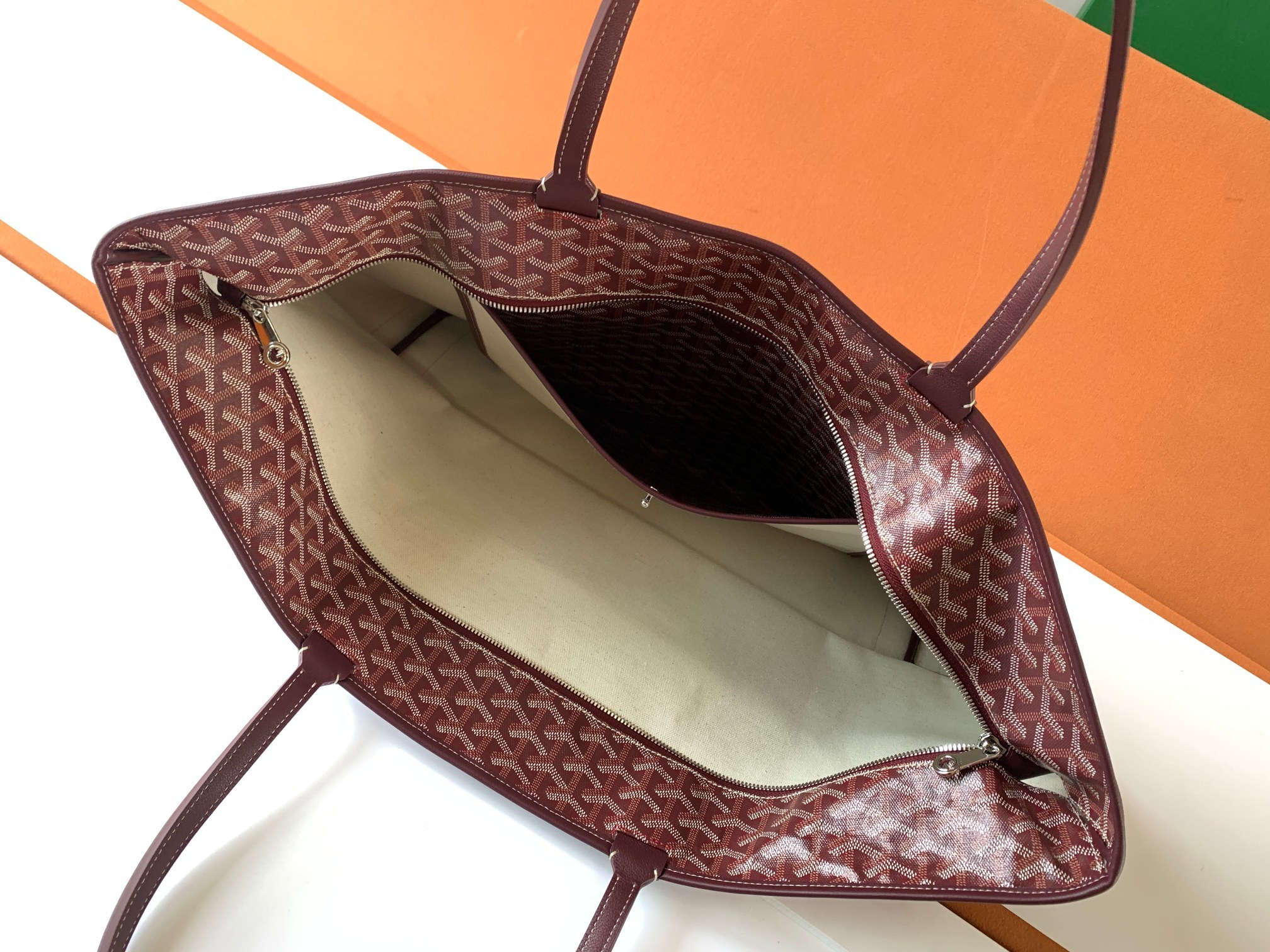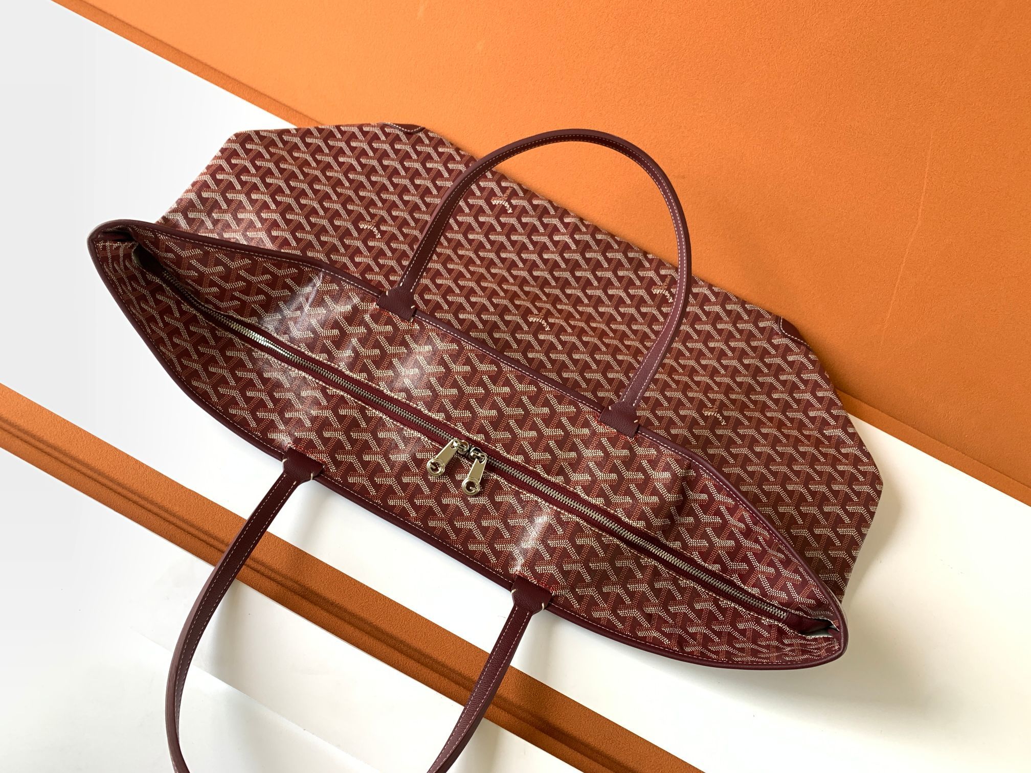 This is a replica GOYARD Artois GM Bag in burgendy. The Artois GM bag uses the aesthetic lines and codes of our Artois PM and MM bags in a travel format, ideal for a weekend or as carry-on luggage. The handles ensure comfort when worn over the shoulder. The zip closure has two lockable zips to secure the contents.,