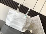 This is a replica GOYARD Artois GM Bag in white. The Artois GM bag uses the aesthetic lines and codes of our Artois PM and MM bags in a travel format, ideal for a weekend or as carry-on luggage. The handles ensure comfort when worn over the shoulder. The zip closure has two lockable zips to secure the contents.,