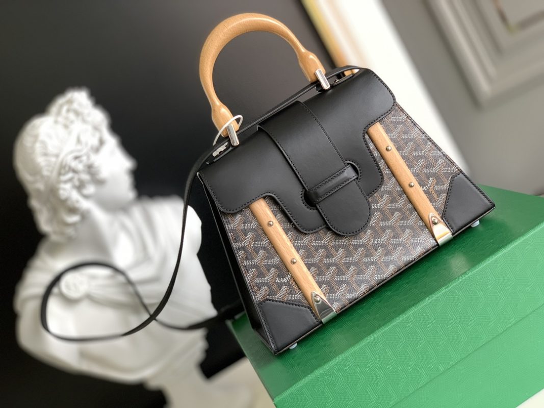 This is a replica GOYARD Bohème Hobo Bag in black and tan. The Bohème Hobo bag epitomizes lightness, flexibility, and safety thanks to its zip closure. It is very comfortable as a shoulder bag thanks to its wide handle. It also features the emblematic removable pouch that closes with a snap fastener.,