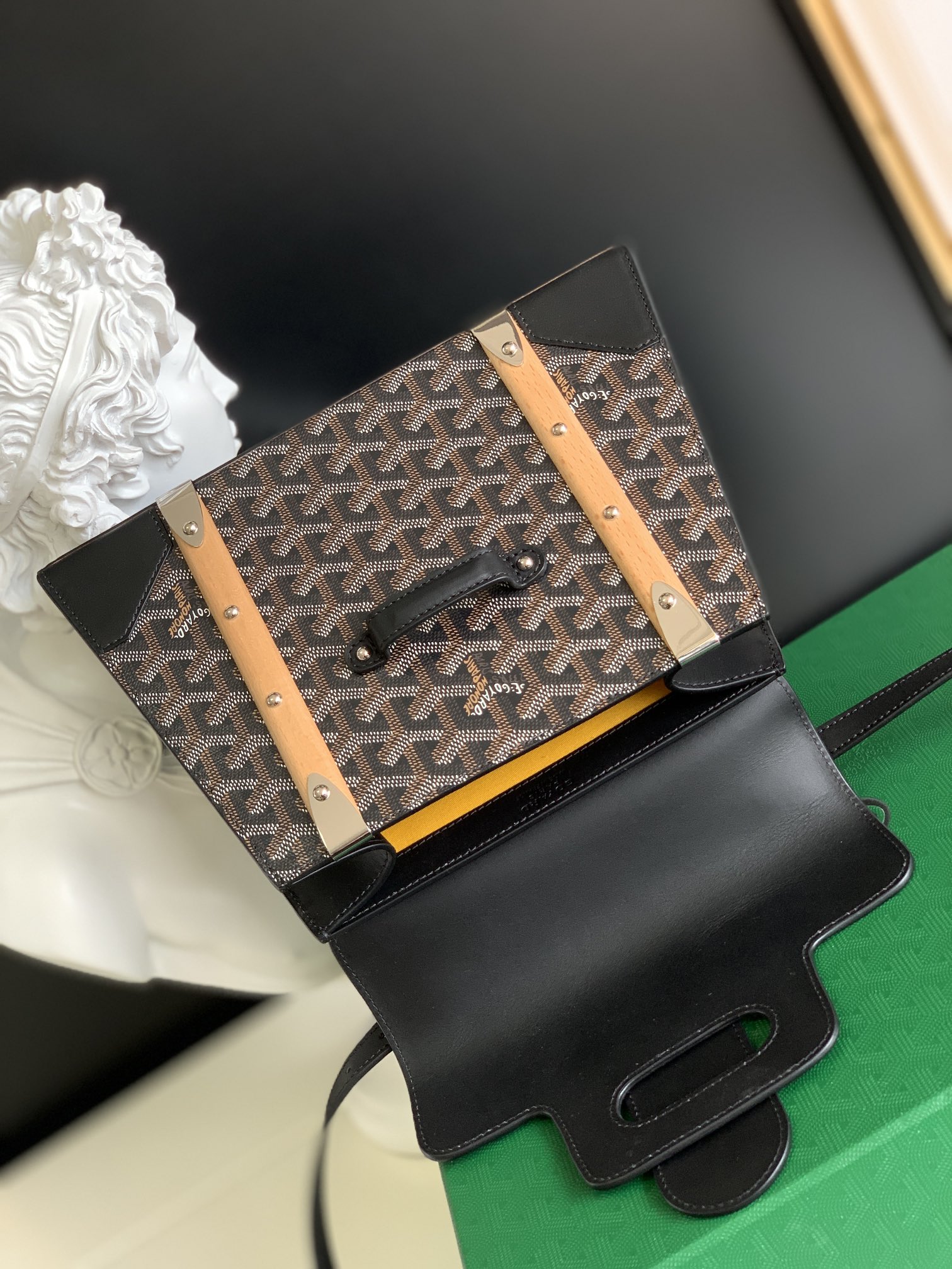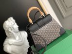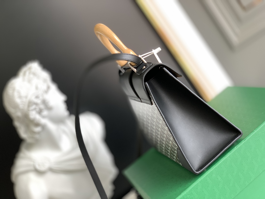 This is a replica GOYARD Saïgon PM Bag in black and tan. The Saïgon bag is one of Maison Goyard’s emblematic pieces as it inherits all our trunk-making signature codes like the wood batons, leather corners and trunk rivets. In this structured PM format, the Saïgon bag can be worn with or without a strap for an elegant evening style.,