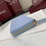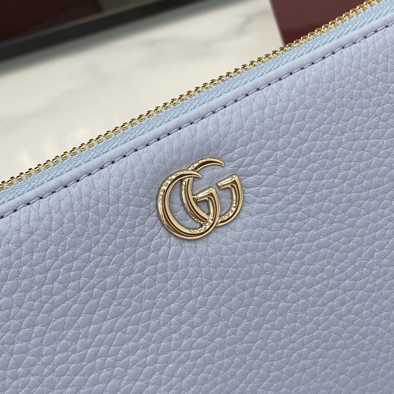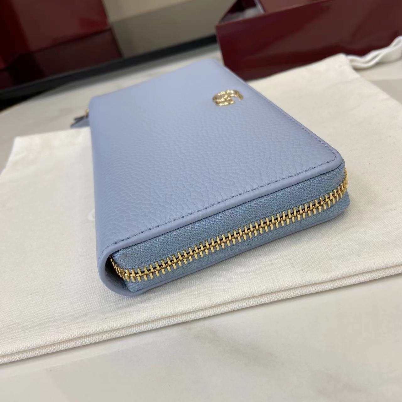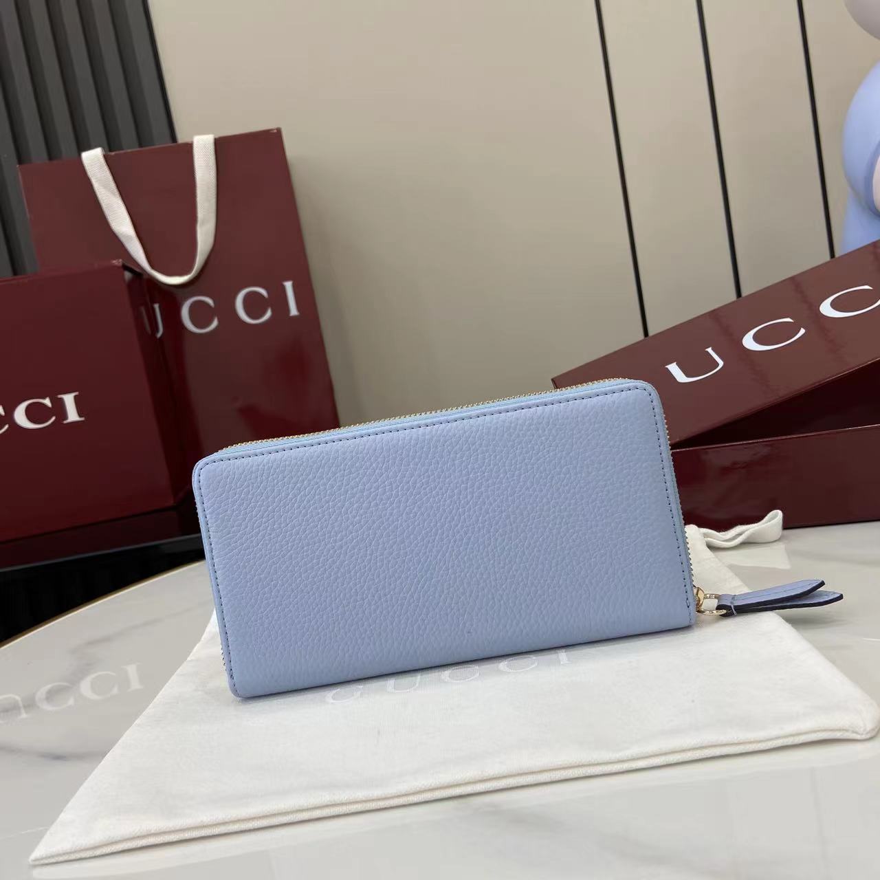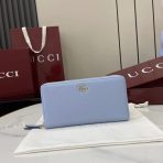 ,Light blue and beige leather,Gold-toned hardware,Taupe taffeta lining,Double G,12 card slots and three bill compartments,Zip coin pocket,Zip around closure,Weight: 0.50lbs approximately,7.5″W x 4.1″H x .8″D