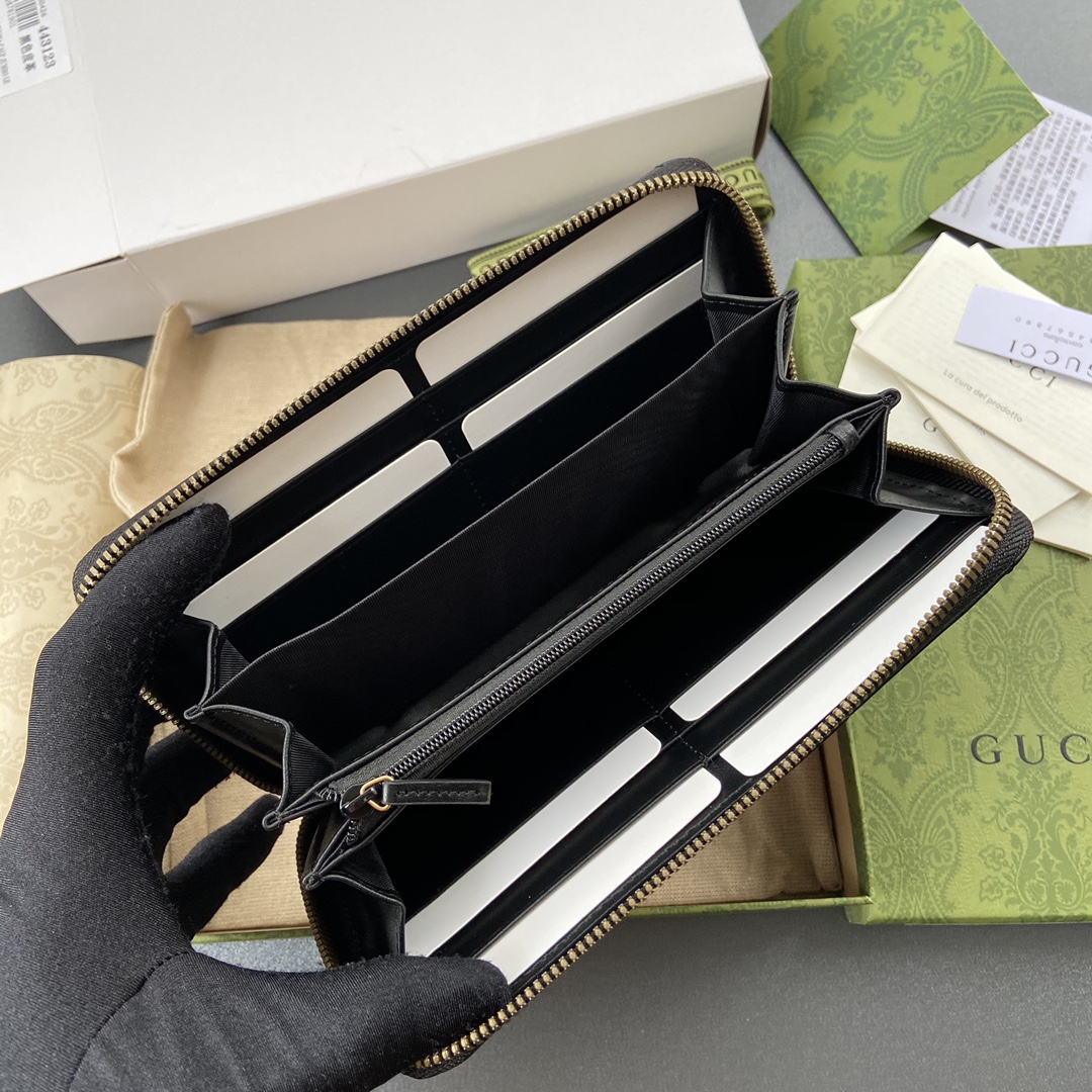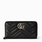 ,Black matelassé chevron leather with GG on the back,Antique gold-toned hardware,Double G,12 card slots and three bill compartments,Zip coin pocket,Zip around closure,7.4″W x 4″H x .7″D,Weight: 0.4lbs, approximately
