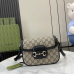 This is a replica GUCCI Horsebit 1955 Soft Mini Shoulder Bag in beige and black. It continues its equestrian-inspired design with b,