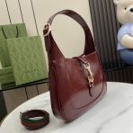 This is a replica GUCCI Jackie 1961 Small Shoulder Bag in Rosso Ancora patent leather. Crafted from fine leather which highlights its craftsmanship, it comes in crescent shape, and sleek silhouette. Light gold-toned hardware, leather trim, and an additional strap featuring the green and red Web.,Size,