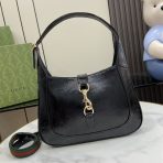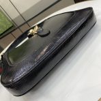 This is a replica GUCCI Jackie 1961 Small Shoulder Bag in Black patent leather. Crafted from fine leather which highlights its craftsmanship, it comes in crescent shape, and sleek silhouette. Light gold-toned hardware, leather trim, and an additional strap featuring the green and red Web.,Size,