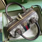 This is a replica GUCCI Ophidia mini top handle bag in Beige and ebony GG Supreme. Brown leather trim. ,Size: Mini,