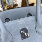 ###This Birkin is in Bleu lin togo leather with palladium hardware and has tonal stitching, front flap, two straps with center toggle closure, clochette with lock and two keys, and double rolled handles.###