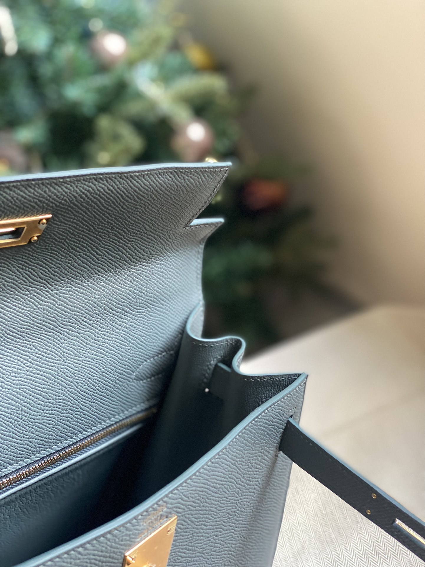 ###This Kelly, in the Sellier style, is in ### with gold hardware and has tonal stitching, front flap, two straps with center toggle closure, clochette with lock and two keys a single rolled handle and removable shoulder strap.###