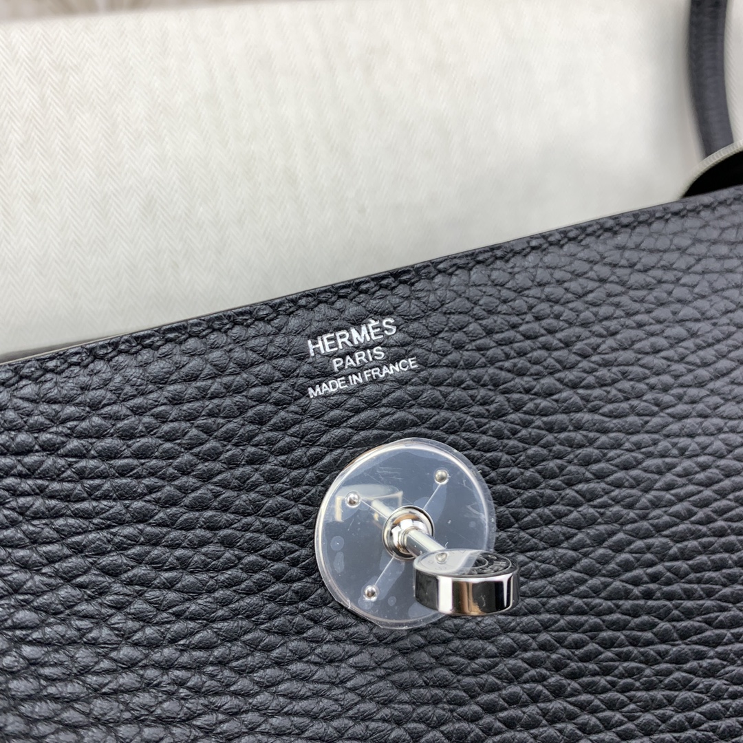 ###This Lindy is of Noir clemence with palladium hardware and features contrast stitching, double zipper pulls, center Hermès twist lock closure, five palladium feet, and two top handles that are linked by a removable shoulder strap.###