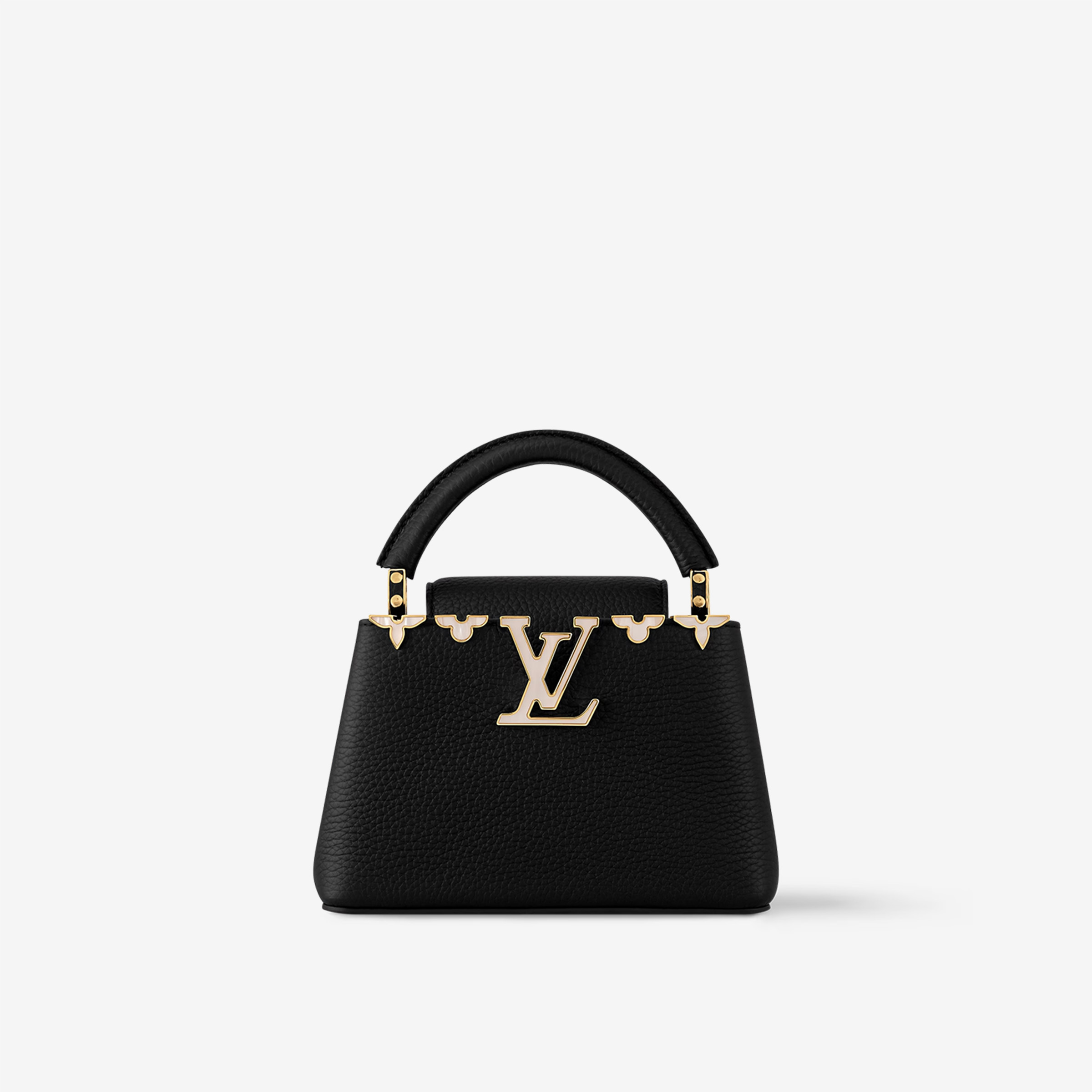 This is a replica LOUIS VUITTON M11342 Capucines Mini. ,8.3 x 5.4 x 3.1 inches ,Black,Taurillon leather,Taurillon-leather trim,Cowhide-leather lining,Mother-of-pearl effect and gold-toned hardware,Double carry style: flap inside or outside,Compartmented interior,Interior flat pocket,4 protective metal base feet,Strap:Removable, adjustable,Strap drop:18.3 inches,Strap drop max:21.3 inches,Handle:Single