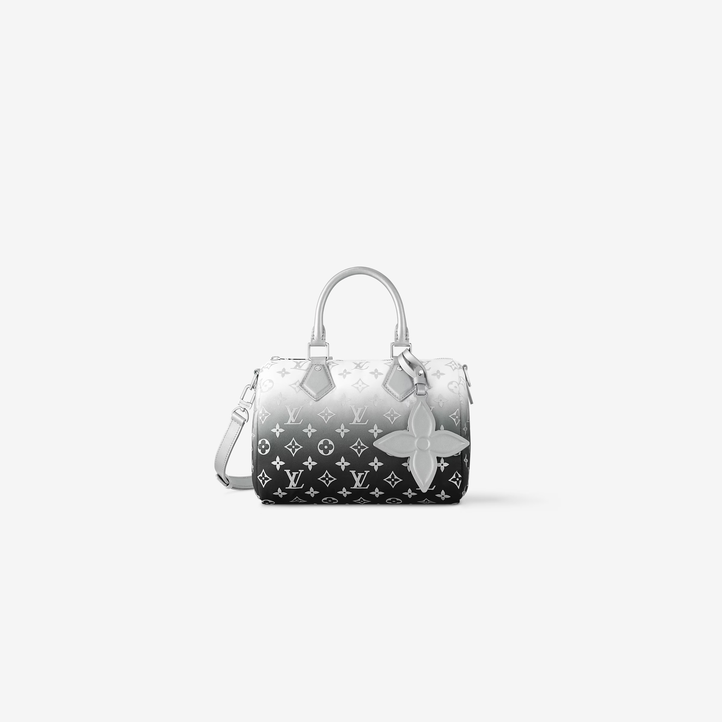 This is a replica LOUIS VUITTON M11848 Speedy Bandoulière 25. ,9.8 x 7.5 x 5.9 inches ,Frost,Monogram Nylon,Leather trim,Polyester lining,Silver-toned hardware,Zip closure,1 inside flat pocket,1 leather flower charm,Fits: Smartphone, keys, Zippy wallet and earphones,Strap:Removable, adjustable,Strap drop:18.3 inches,Strap drop max:21.7 inches,Handle:Double