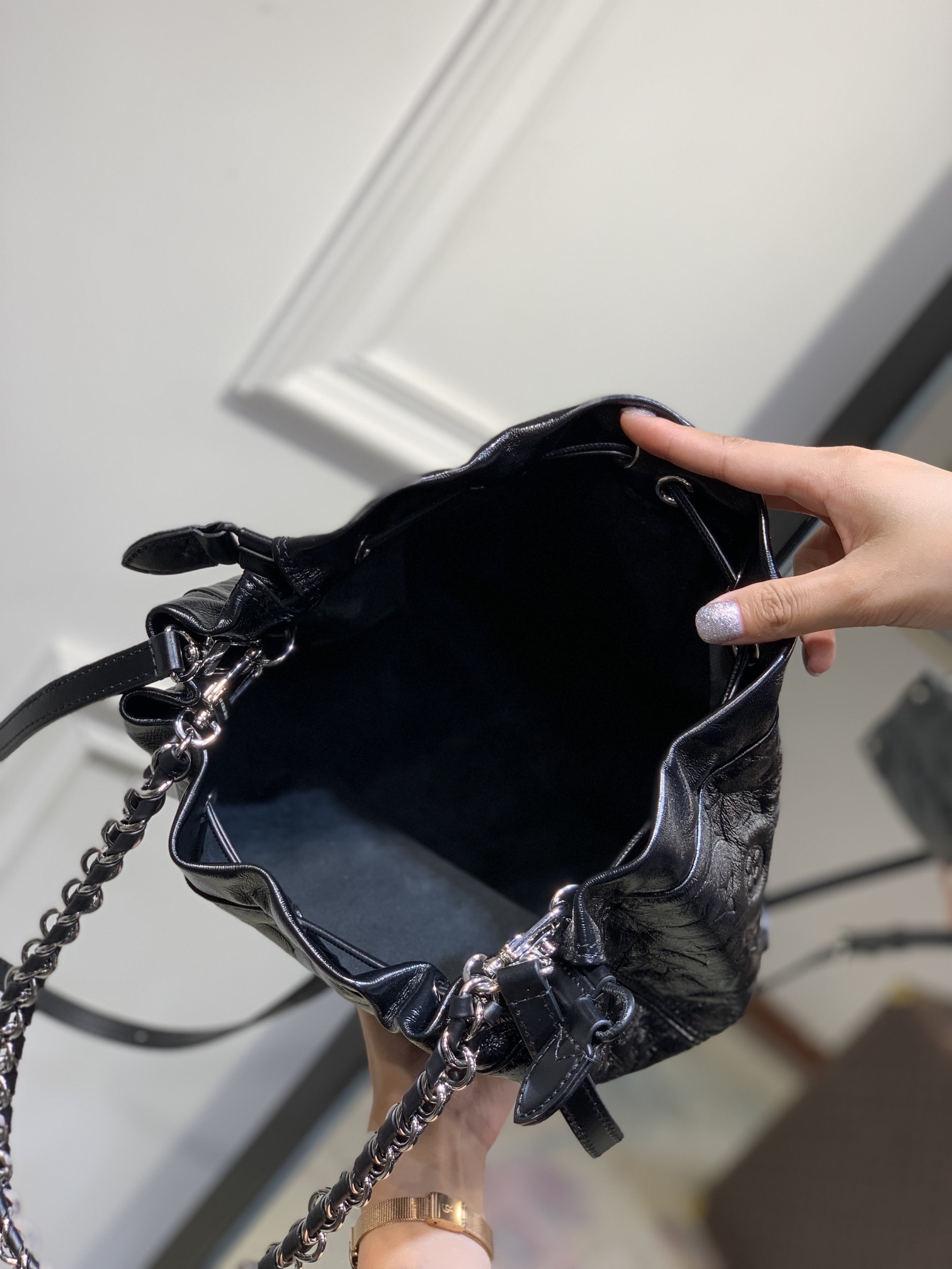 This is a replica LOUIS VUITTON M13484 Noé Trunk PM. ,9.1 x 10.6 x 3.1 inches ,Black,Lambskin leather,Cowhide-leather trim,Microfiber lining,Silver-toned hardware,Drawstring closing system,Strap:Removable, adjustable,Strap drop:20.9 inches,Strap drop max:24.8 inches,Chain:Removable,Chain drop:20.9 inches,Chain drop max:24.8 inches