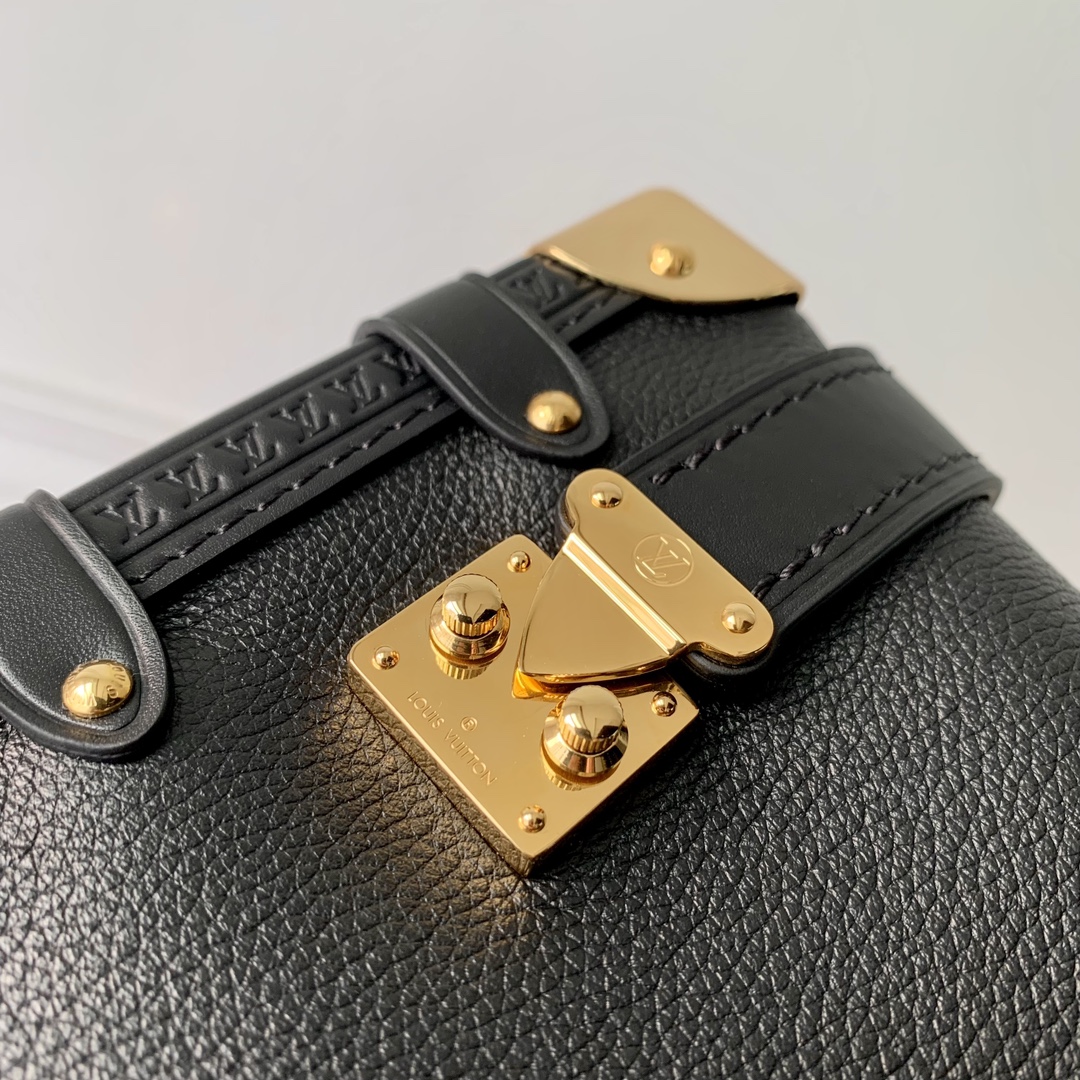 This is a replica LOUIS VUITTON M23817 Side Trunk PM. ,7.5 x 4.9 x 3 inches ,Black,Grained calf leather,Smooth cowhide-leather trim,Microfiber lining,Gold-color hardware,Zip closure with S-lock,Fits: compact wallet, smartphone, keys, earphones, and lipstick,Strap:Removable, adjustable,Strap drop:19.7 inches,Strap drop max:23.6 inches,Handle:Single, removable