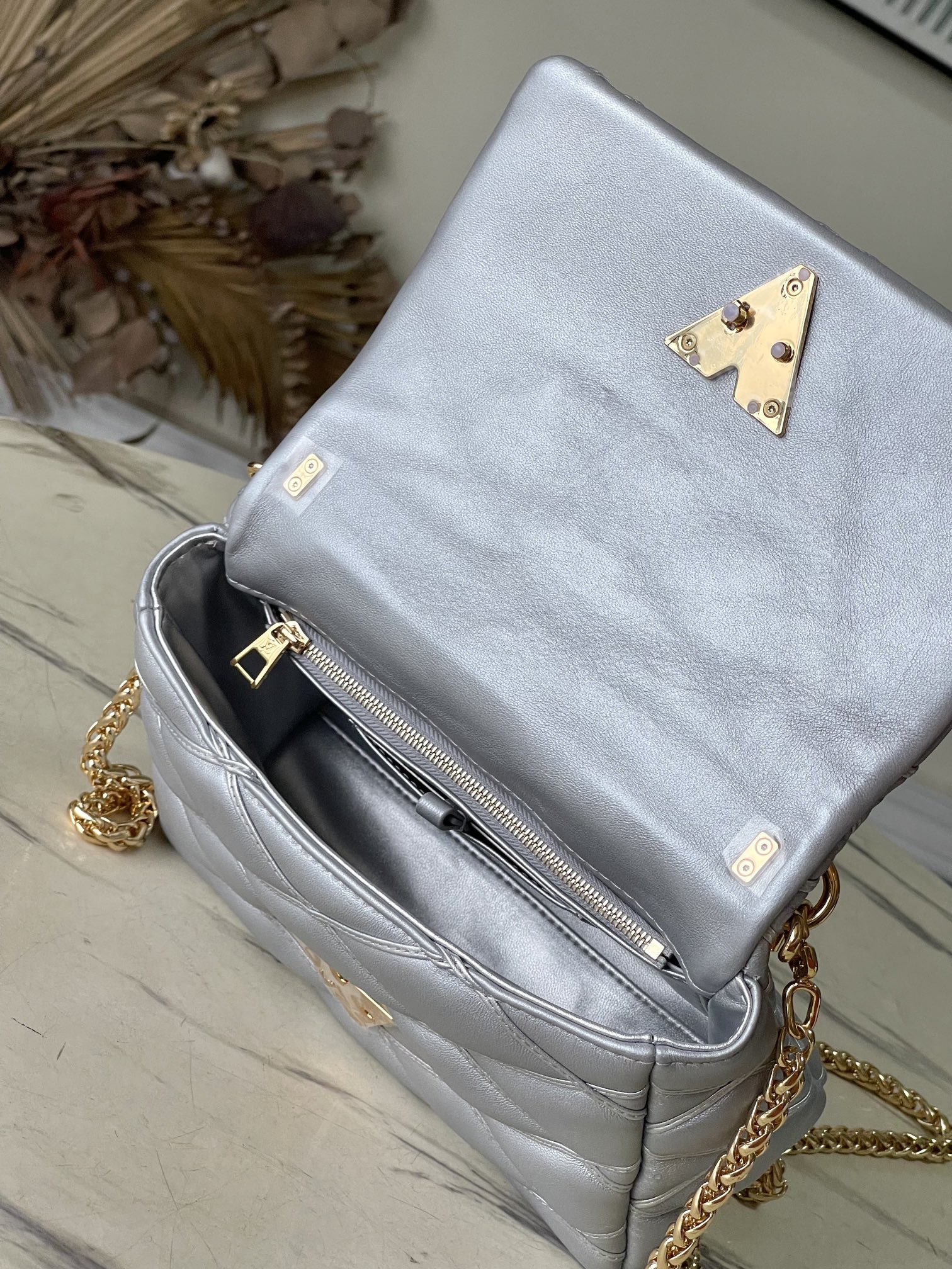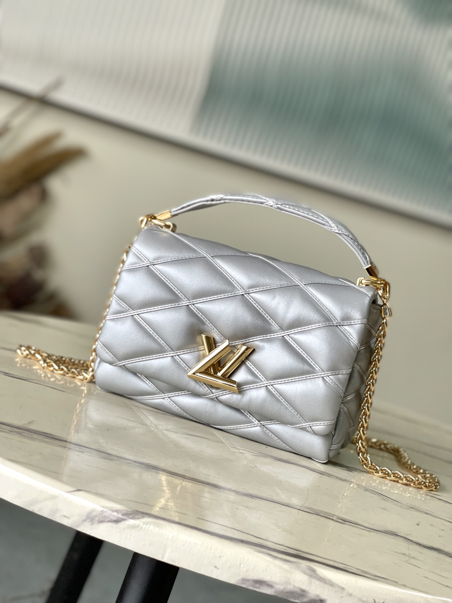 This is a replica LOUIS VUITTON M25107 GO-14 MM. ,9.1 x 6.3 x 3.9 inches ,Silver,Lambskin,Lambskin trim,Cowhide-leather lining,Gold-color hardware,Flap with LV Twist lock,Inside back zipped pocket,Inside back flat pocket with mirror,Fits: 6.7-inches smartphone, Rosalie Coin Purse, earphones, lipstick, tissues, keys, sunglasses,Chain:Sliding, removable,Handle:Single