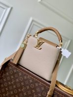 This is a replica LOUIS VUITTON M25466 Capucines BB. ,27 x 17.3 x 9 cm ,Cream/Arizona Beige,Taurillon leather,Cowhide and Taurillon leather trim,Cowhide leather lining,Gold-colour hardware,Double-carry style: flap inside or outside,1 removable tassel charm with a decorative padlock,Compartmented interior with 1 zipped pocket and 2 flat pockets,4 protective metal base feet,Fits smartphone, earphones, LV Vertical Wallet, keys,Strap: Removable, adjustable,Strap Drop: 46.5 cm,Strap Drop Max: 55.0 cm,Handle: Single