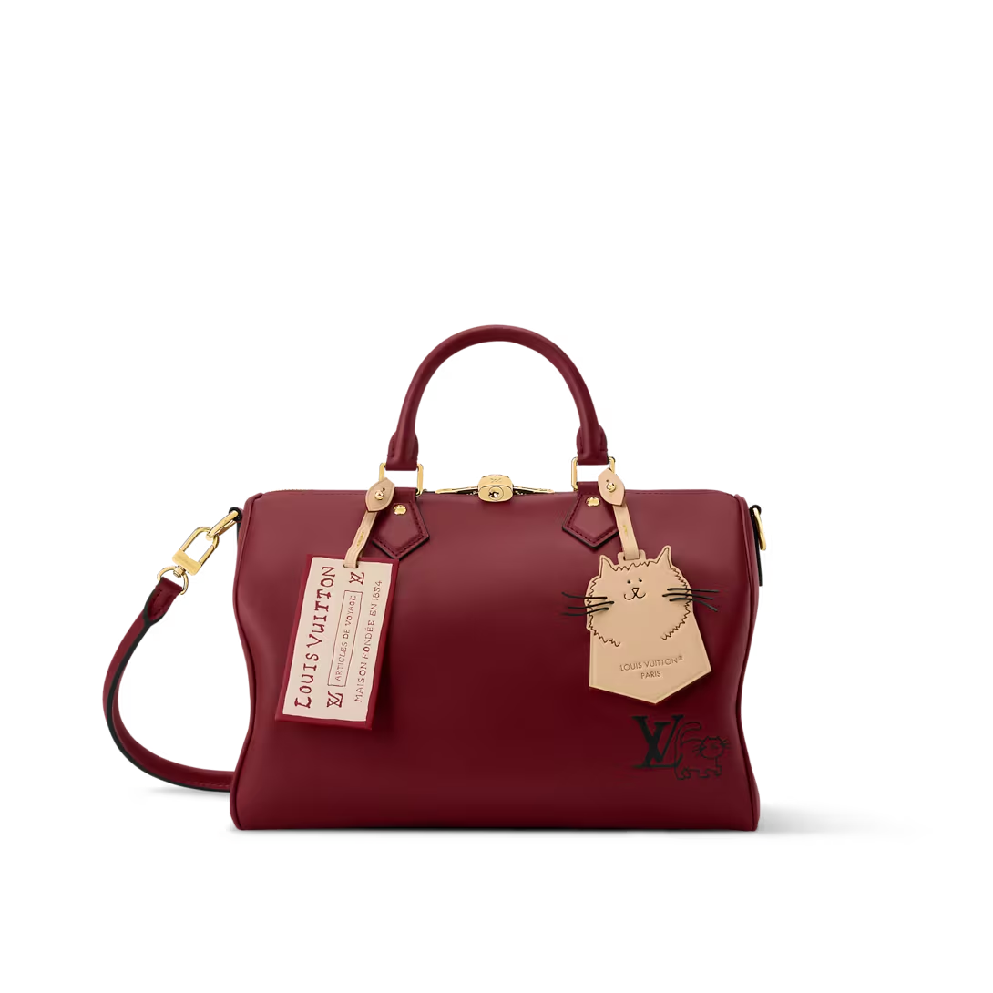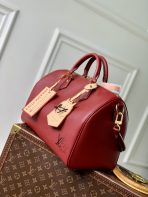 This is a replica LOUIS VUITTON M25766 Speedy Soft 30 Bag. ,The Speedy Soft 30 bag is updated for the season as part of the exclusive LV Travels With Grace Coddington Collection. It is crafted from calf leather in a Plum Purple shade adorned with gold-toned hardware and a playful cat-shaped key bell. The capacious design also features a removable name tag that is printed with Grace Coddington’s handwriting.,21 x 17 x 30 cm ,Plum Purple,Calfskin,Calfskin trim,Textile lining,Gold-colour hardware,Double zip closure,1 zipped pocket,1 removable name tag leather charm,1 removable cat-shaped key bell,Fits a smartphone, earphones, Zippy wallet and keys,Strap: Removable, adjustable,Strap Drop: 42.0 cm,Strap Drop Max: 50.0 cm,Handle: Single x2