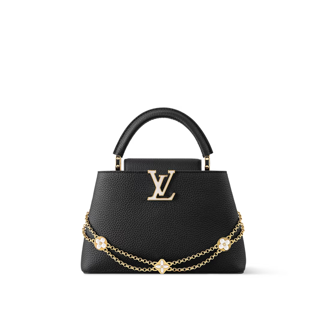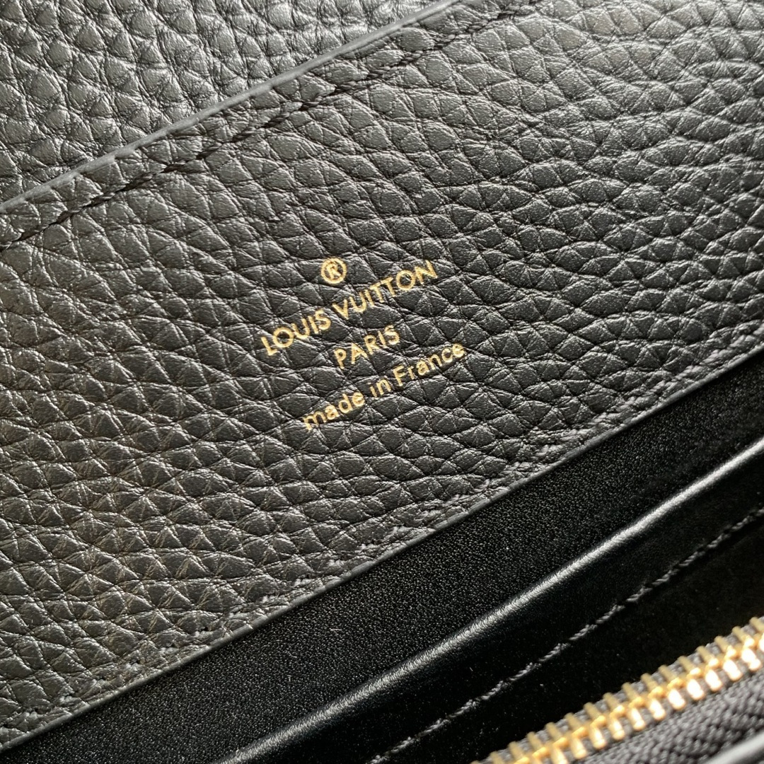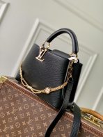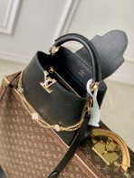 This is a replica LOUIS VUITTON M25862 Capucines BB. ,27 x 19 x 9 cm ,Black,Taurillon leather,Cowhide leather trim,Cowhide leather lining,Gold-colour and mother-of-pearl effect hardware,1 removable decorative chain,Double carry style: flap inside or outside,Compartmented interior with 1 zipped pocket and 2 flat pockets,4 protective metal base feet,Fits smartphone, earphones, LV Vertical Wallet, keys,Strap: Removable, adjustable,Strap Drop: 48.0 cm,Strap Drop Max: 53.0 cm,Chain: Removable,Chain Drop: 29.5 cm,Handle: Single