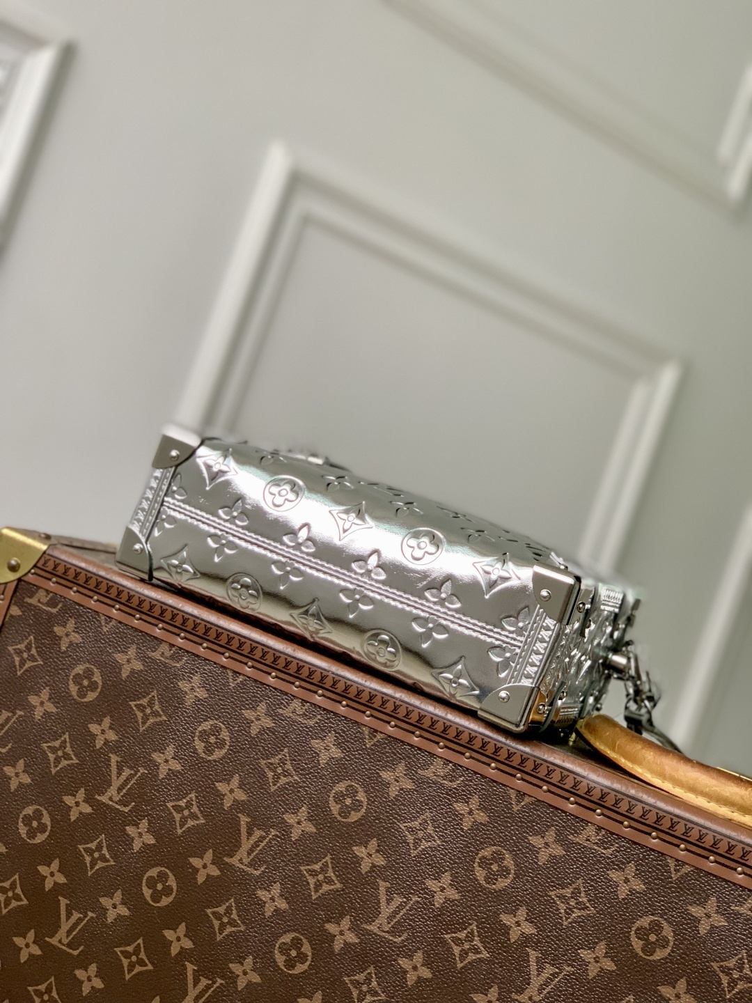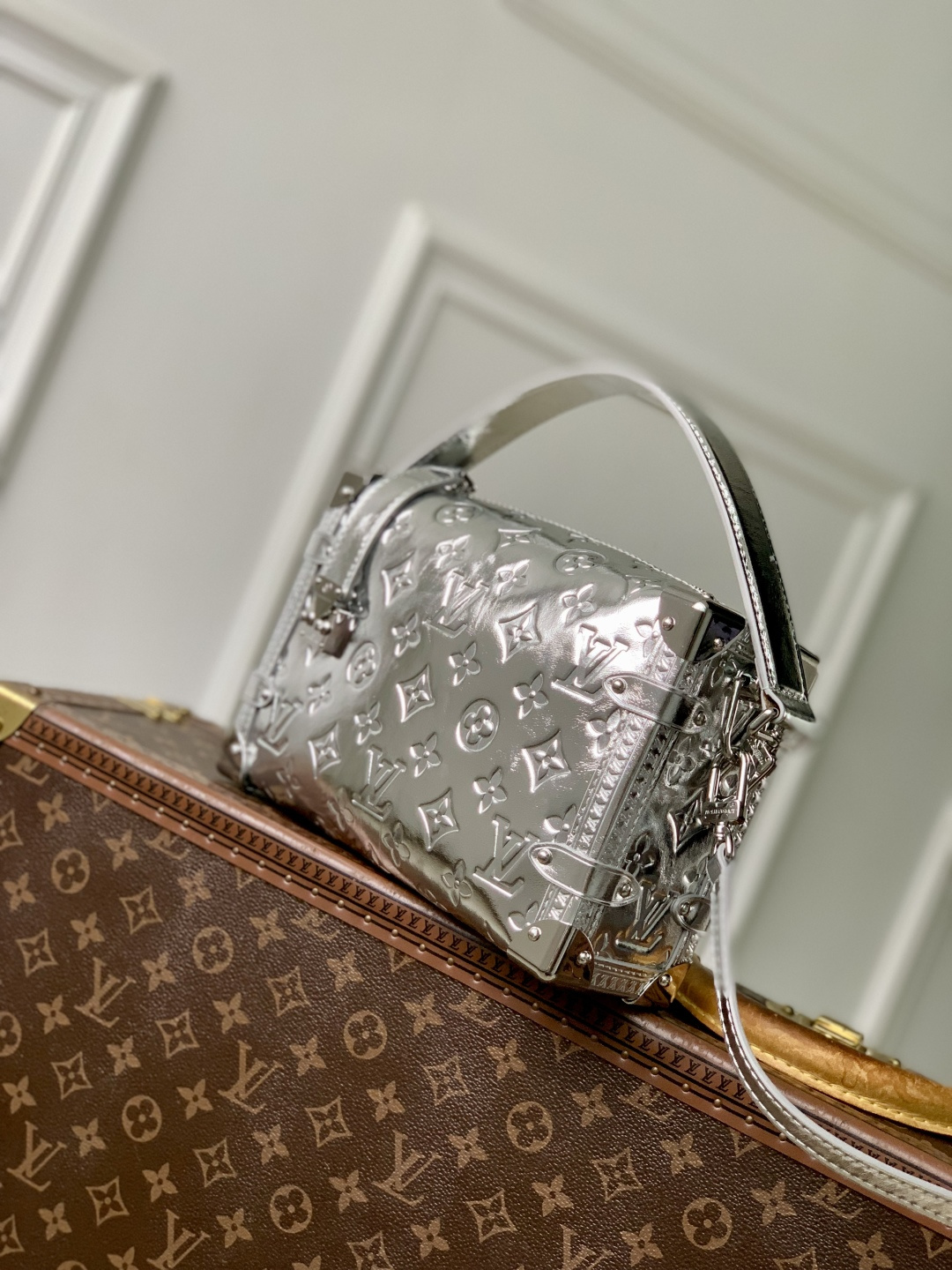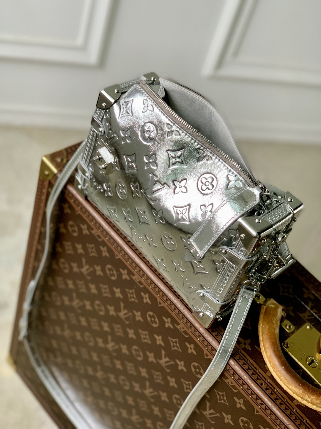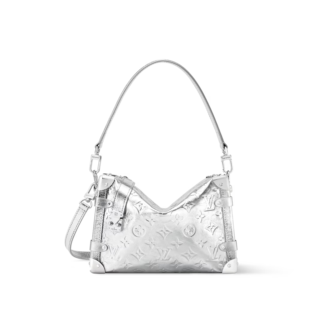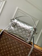 This is a replica LOUIS VUITTON M26223 Side Trunk MM. ,23.5 x 16 x 8.5 cm ,Silver,Calfskin,Cowhide leather trim,Cowhide leather lining,Silver-colour hardware,Zip closure with S-lock,Fits smartphone, earphones, Zippy wallet, keys, lipstick,Strap: Removable, adjustable,Strap Drop: 45.0 cm,Strap Drop Max: 55.0 cm,Handle: Single, removable