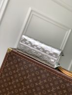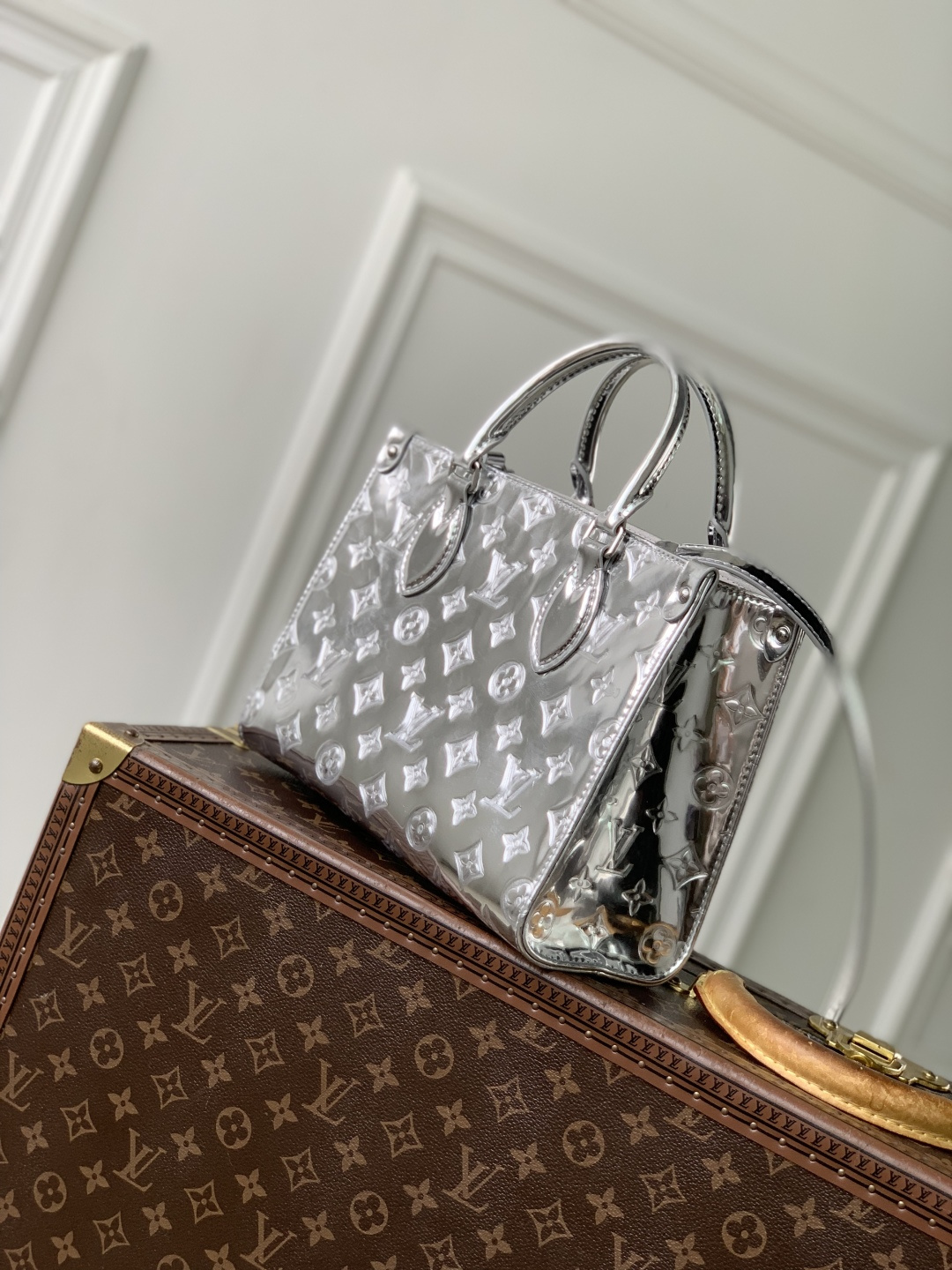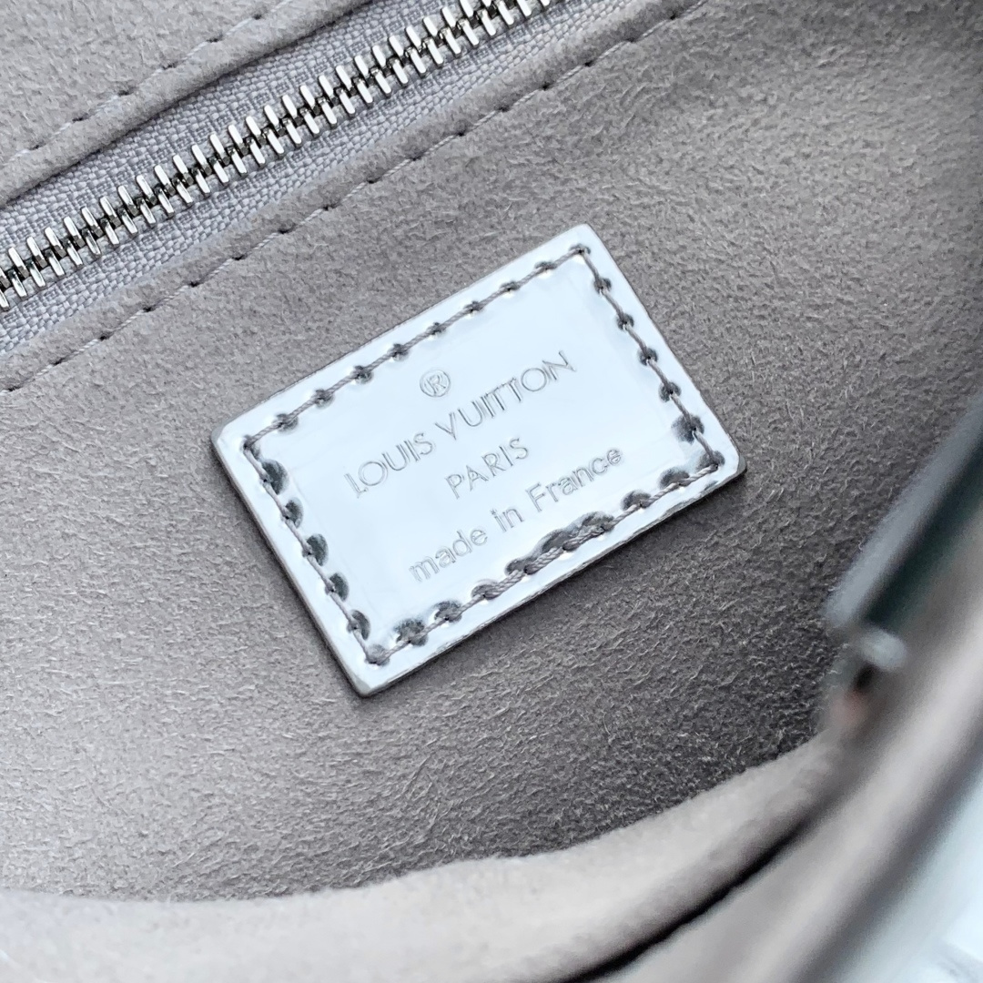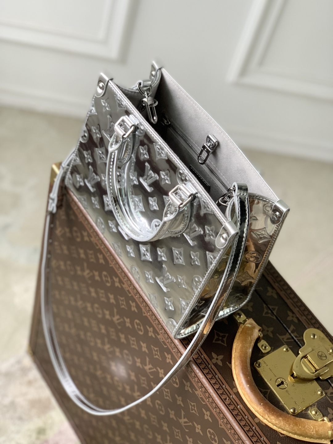 This is a replica LOUIS VUITTON M26373 OnTheGo PM. ,25 x 19 x 11.5 cm ,Silver,Coated canvas,Coated canvas trim,Textile lining (cotton and polyester),Silver-colour hardware,1 snap hook closure,1 inside flat zipped pocket,2 inside flat pockets,Fits 6.7-inch smartphone, earphones, Sarah long wallet, small book, keys, lipstick,Strap: Removable, non-adjustable,Strap Drop: 51.0 cm,Handle: Single x2