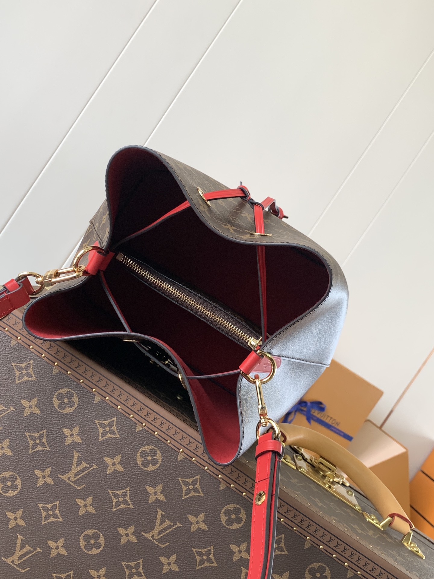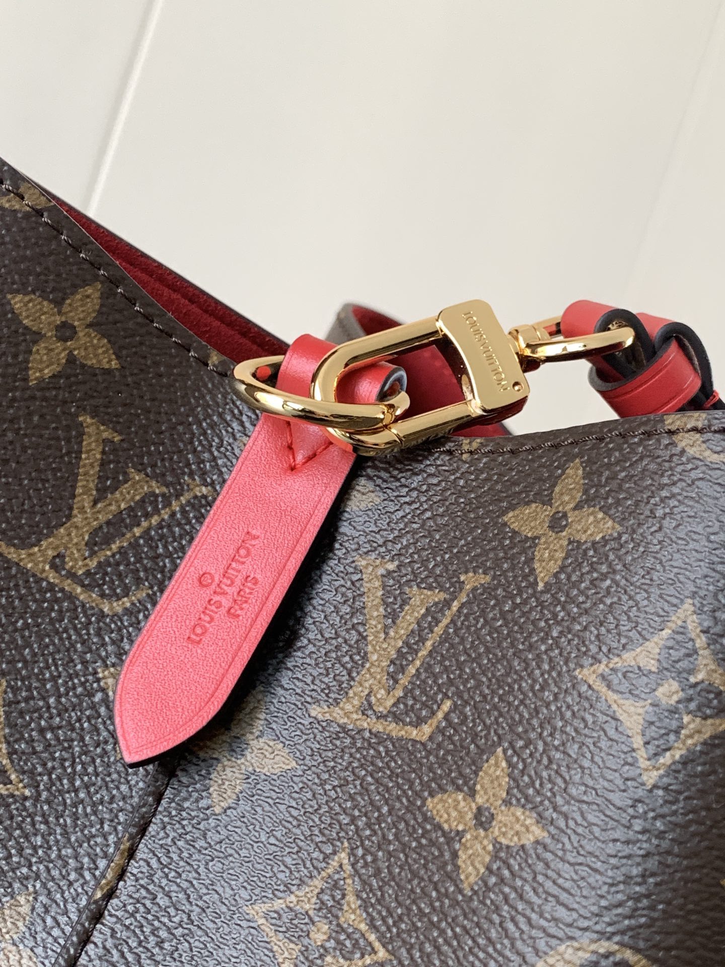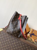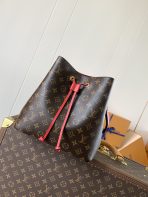 This is a replica LOUIS VUITTON M44021 NéoNoé MM. ,10.2 x 10.2 x 6.9 inches ,Coquelicot Red,Monogram coated canvas,Colored cowhide leather trim,Microfiber lining,Gold-color hardware,2 compartments,Zipped central pocket,Metal eyelets,Fits: smartphone, Victorine Compact Wallet, tissues, lipstick, earphones, keys,Strap:Removable, adjustable,Strap drop:12.2 inches,Strap drop max:21.3 inches,Handle:Single, removable