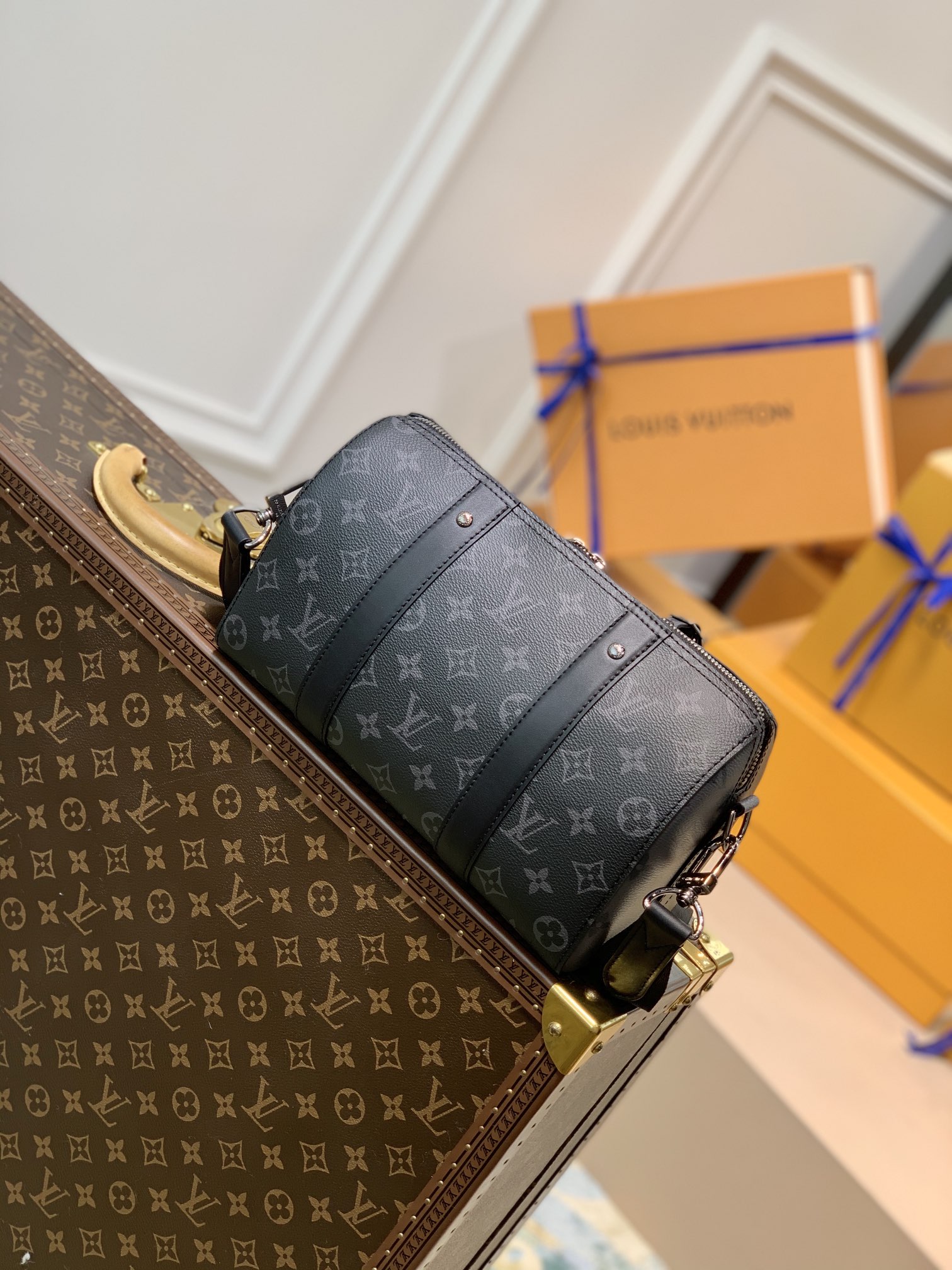 This is a replica LOUIS VUITTON M45936 City Keepall. ,27 x 17 x 13 cm ,Monogram Eclipse and Monogram Eclipse Reverse coated canvas,Cowhide leather trim,Textile lining,Black hardware,Double zipped closure,Large main compartment,Removable name tag,Strap: Removable, adjustable,Strap Drop: 45.0 cm,Strap Drop Max: 56.0 cm