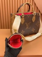 This is a replica LOUIS VUITTON M46373 OnTheGo PM. ,9.8 x 7.5 x 4.5 inches ,Monogram and Monogram Reverse coated canvas,Textile lining,Gold-color hardware,Inside flat zipped pocket,Inside double pocket,4 riveted corner tabs,Fits: 13-inch laptop, smartphone, keys, Zippy wallet and earphones,Weight: 0.6 kg,Strap:Removable, adjustable,Strap drop:18.9 inches,Strap drop max:20.5 inches,Handle:Double