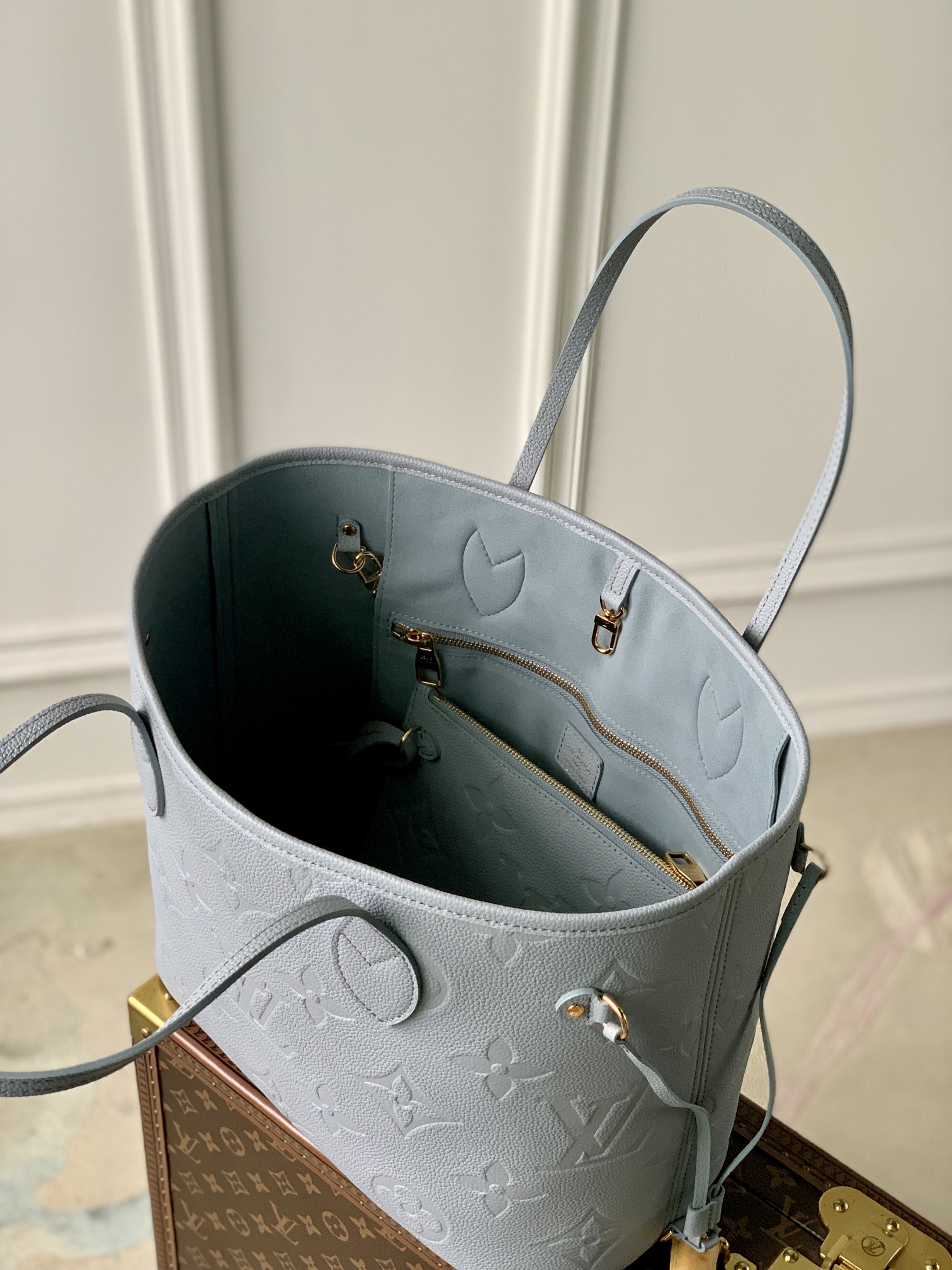 This is a replica LOUIS VUITTON M46482 Neverfull MM. ,12.2 x 11 x 5.5 inches ,Blue Hour,Embossed cowhide leather,Cowhide-leather trim,Microfiber lining,Gold-color hardware,Hook closure,Inside zipped pocket,4 side laces,Fits: 13-inch laptop, Smartphone, keys, Zippy wallet and earphones,Weight: 0.9 kg,Handle:Double