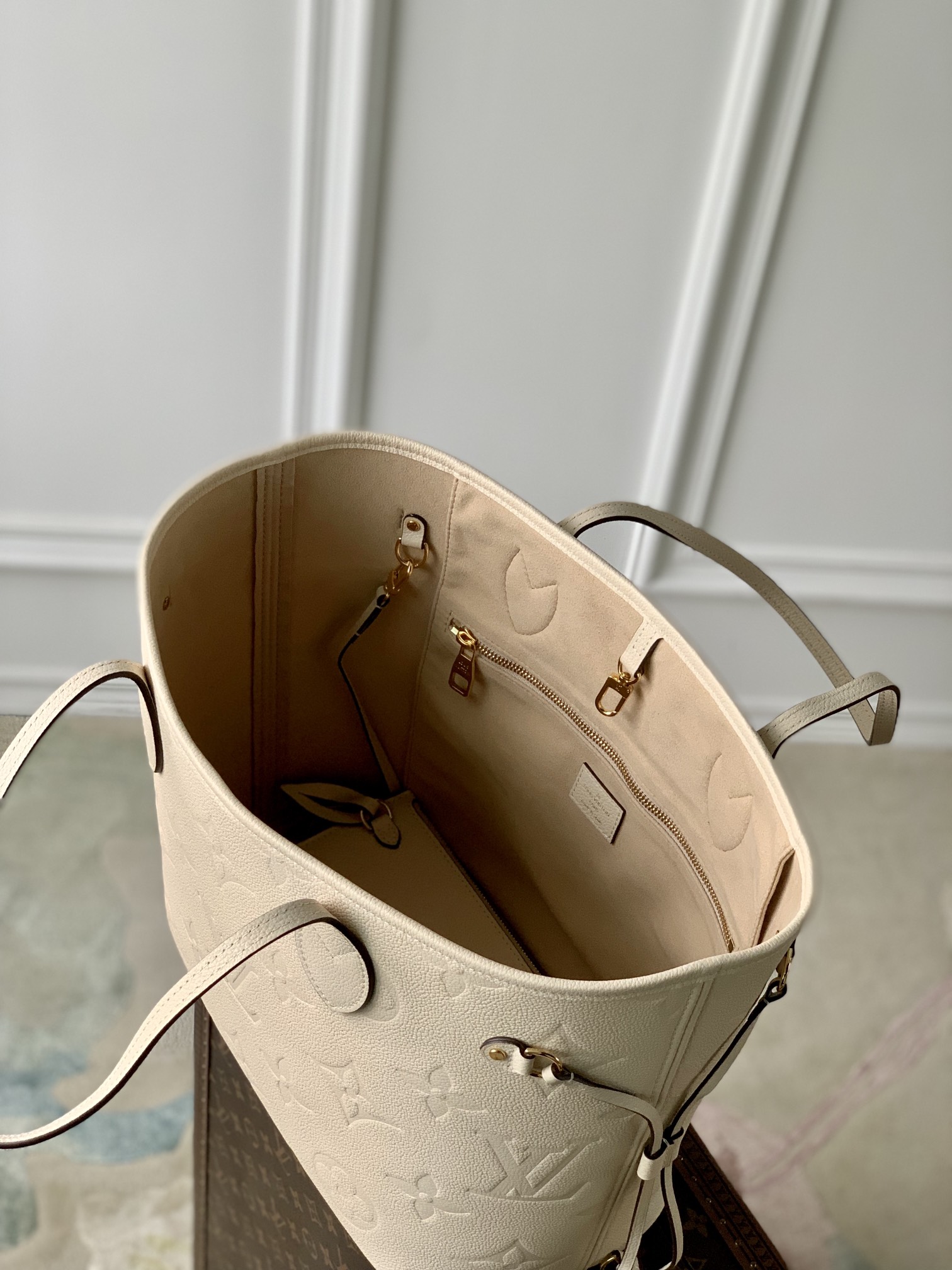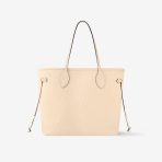 This is a replica LOUIS VUITTON M46676 Neverfull MM. ,12.2 x 11 x 5.5 inches ,Creme Beige,Embossed cowhide leather,Cowhide-leather trim,Microfiber lining,Gold-color hardware,Hook closure,Inside zipped pocket,4 side laces,Fits: 13-inch laptop, Smartphone, keys, Zippy wallet and earphones,Weight: 0.9 kg,Handle:Double