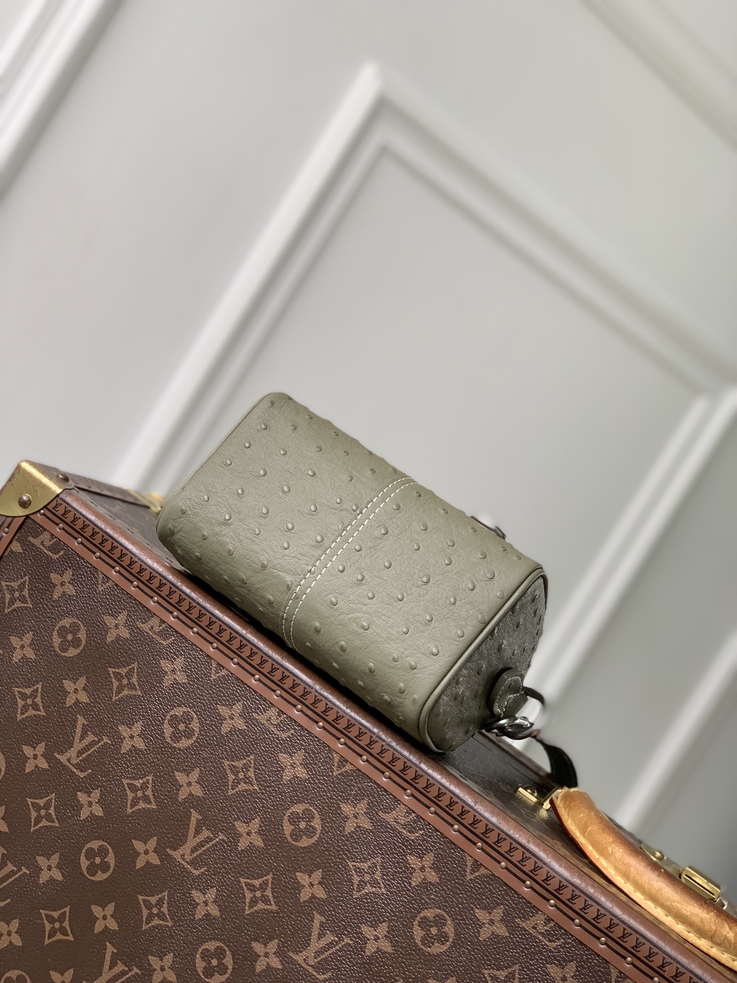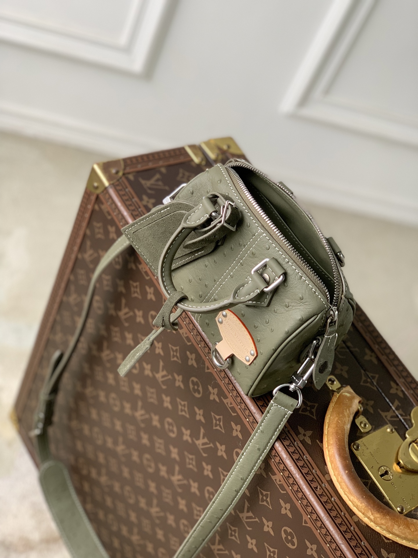 Ostrich leather, calfskin and suede trim