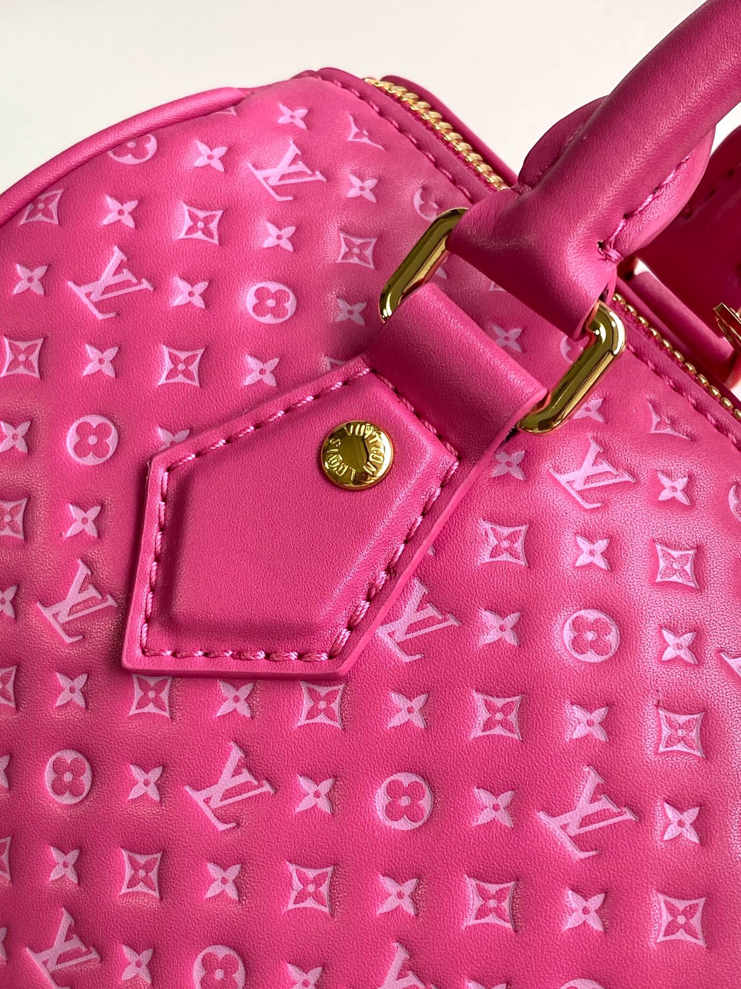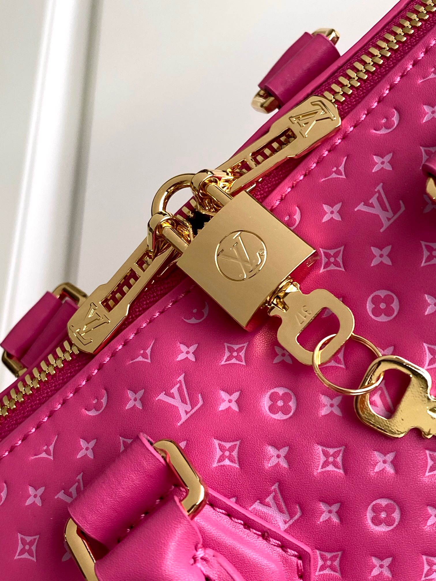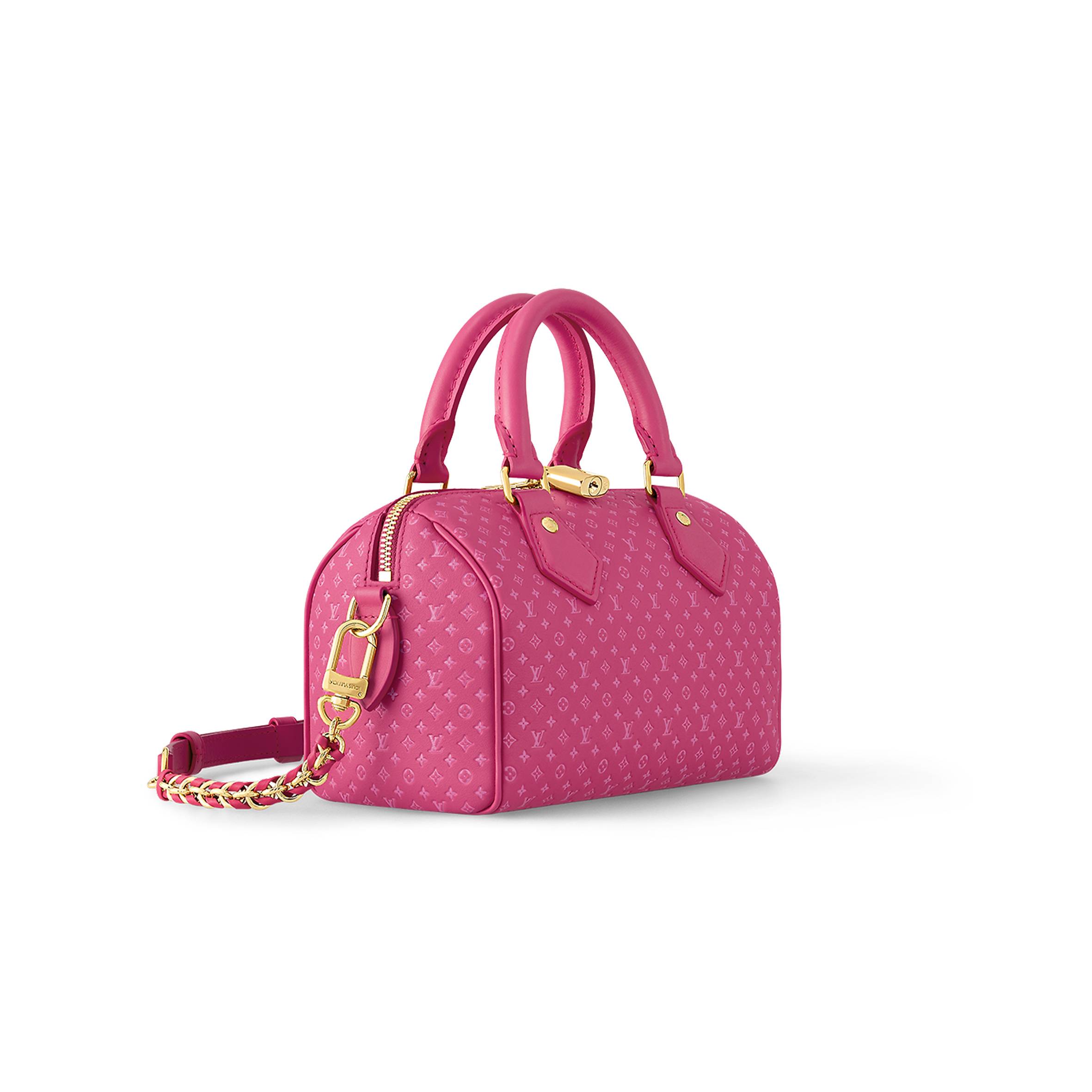 Fashioned from calfskin with a very small Monogram motif embossed then printed on the leather, this Speedy 20 handbag is part of the Nanogram capsule. Its inimitable silhouette, and engraved padlock, make this bag instantly recognizable. A removable and adjustable braided-chain-and-leather strap enables shoulder or cross-body carry.