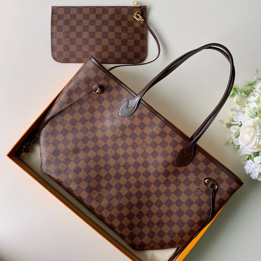 This is a replica LOUIS VUITTON N40599 Neverfull MM. ,12.2 x 11 x 5.5 inches ,Cerise Red,Damier Ebene coated canvas,Natural cowhide-leather trim,Striped textile lining,Gold-color hardware,4 side laces,Hook closure,Flat, textile-lined zipped inside pocket,Removable zipped pouch,D-ring,Fits: 13-inch laptop, smartphone, keys, Zippy Long Wallet,Handle:Double