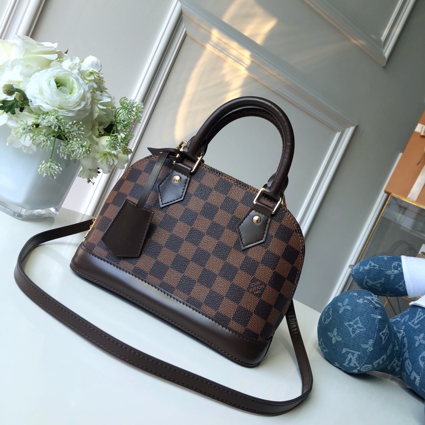 This is a replica LOUIS VUITTON N40606 Alma BB. ,9.3 x 6.9 x 4.5 inches ,Damier Ebene coated canvas,Smooth cowhide-leather trim,Textile lining,Gold-color hardware,Double zip closure,Padlock,Key bell,Inside flat pocket,4 protective metal bottom studs,Fits: 6.7-inch smartphone, earphones, lipstick, tissues, keys, sunglasses,Strap:Removable, adjustable,Strap drop:19.7 inches,Strap drop max:24.4 inches,Handle:Double