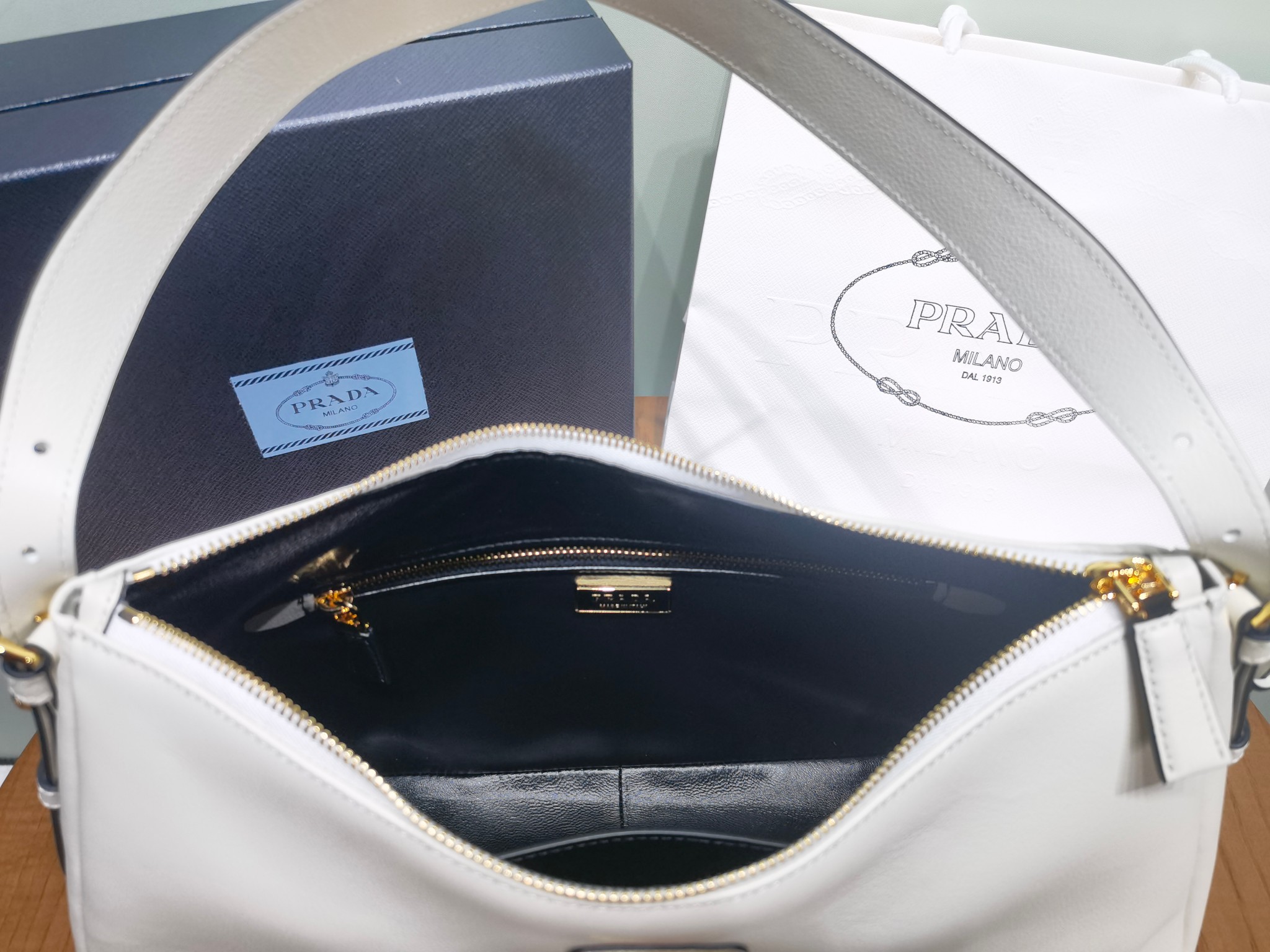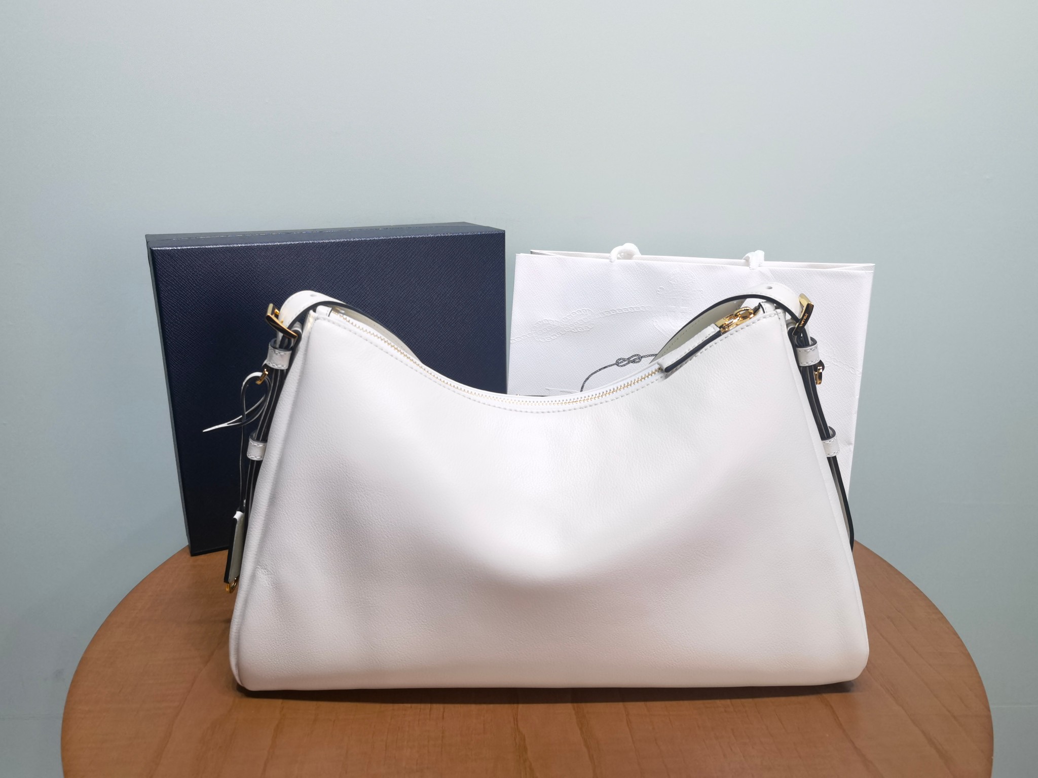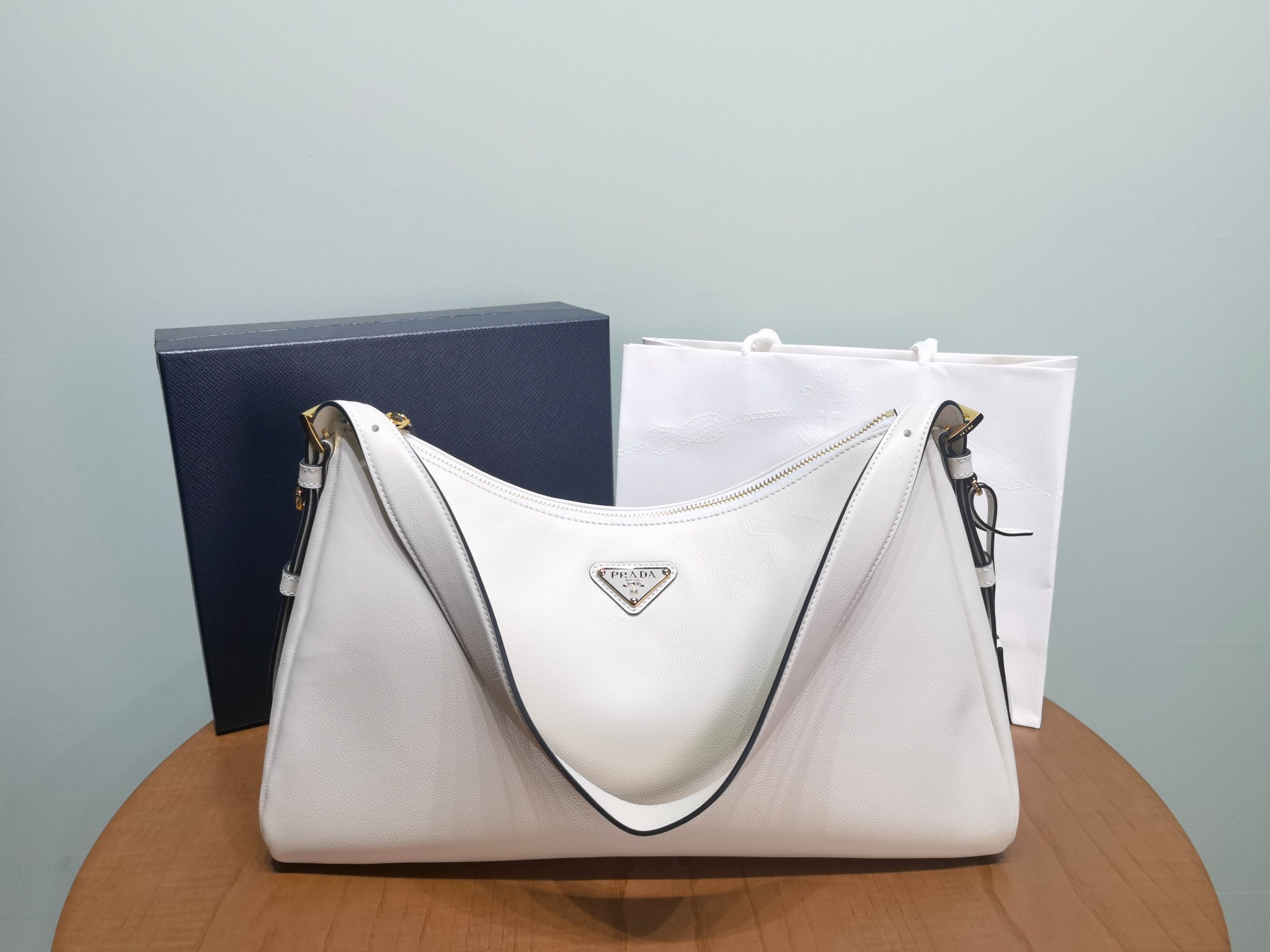This is a replica Prada Aimée 1BC228 large leather shoulder bag. ,With adjustable leather handles. Minimum drop 38 cm – Maximum drop 28 cm,Detachable keychain,Metal hardware accessories,Enameled metal triangle logo on the front,Zipper closure,Nappa leather lining with two interior pockets, one with zipper,