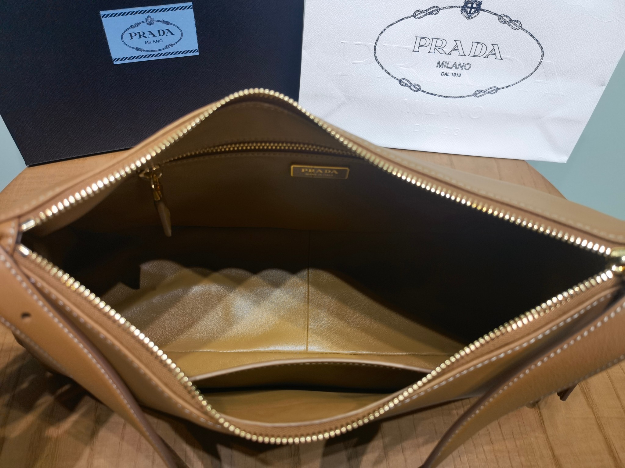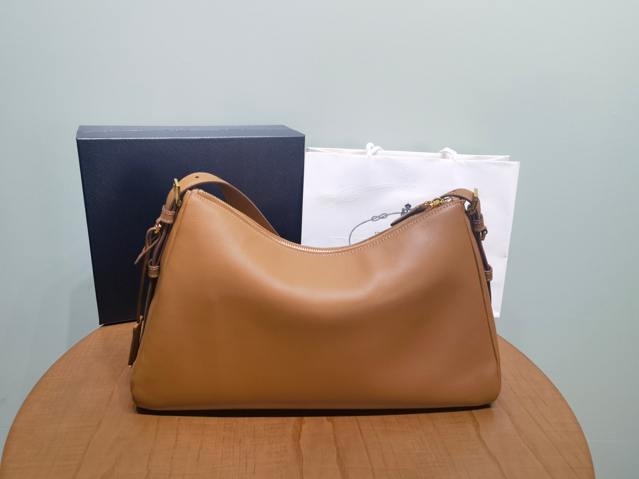 This is a replica Prada Aimée 1BC228 large leather shoulder bag. ,With adjustable leather handles. Minimum drop 38 cm – Maximum drop 28 cm,Detachable keychain,Metal hardware accessories,Enameled metal triangle logo on the front,Zipper closure,Nappa leather lining with two interior pockets, one with zipper,