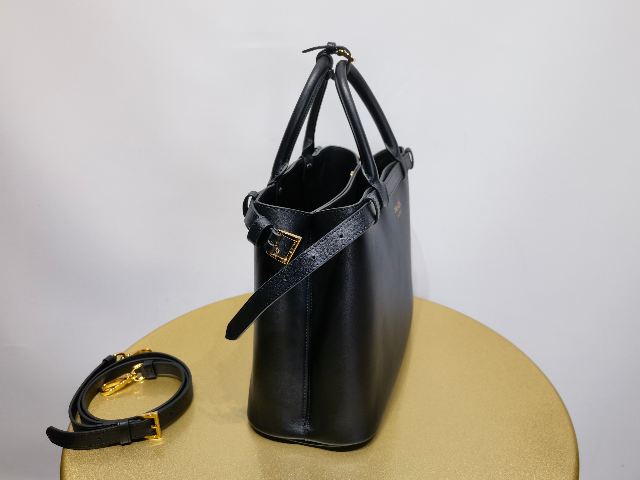 This is a replica Prada Buckle 1BA417 Medium Leather Drawstring Bag. ,Decorative buckle strap,Leather handle,Removable and adjustable leather shoulder strap Maximum length 110 cm – Minimum length 100 cm – Maximum drop 55 cm – Minimum drop 50 cm,Metal hardware accessories,Front printed lettering logo,Nappa leather lining with middle pocket,