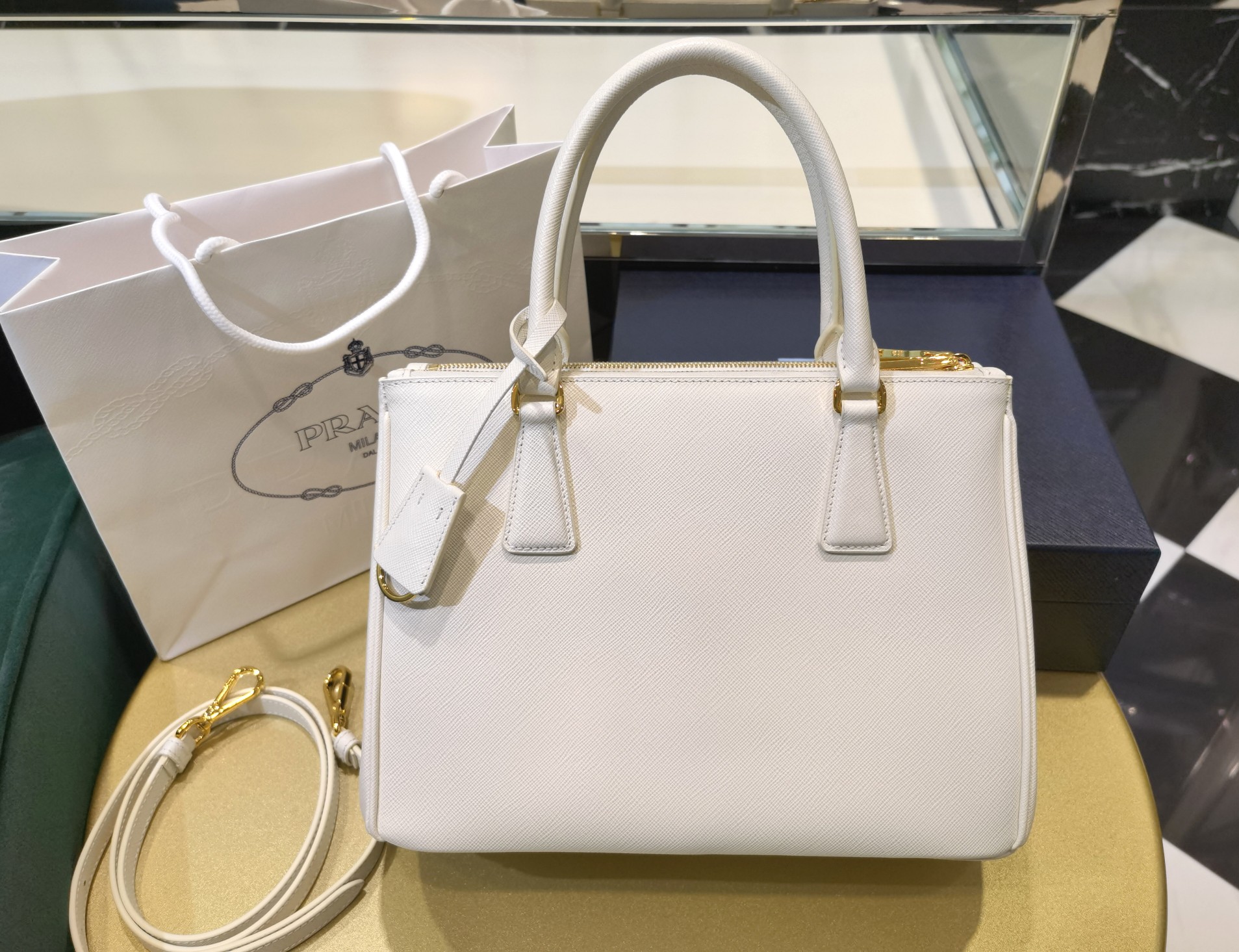 This is a replica Prada Galleria 1BA863 medium leather bag. ,Leather handles,Detachable, adjustable leather shoulder strap. Max. length: 120 cm – Min. length: 110 cm – Max. drop length: 60 cm – Min. drop length: 55 cm,Removable leather key ring,External zipper pockets,Metal hardware,Leather triangle with metal lettering logo on the front,Snap closure on the sides,Logo-print nylon lining with two pockets, including one with zipper,With purse feet,Height: 19.5cm,Width: 28cm,Length: 12cm