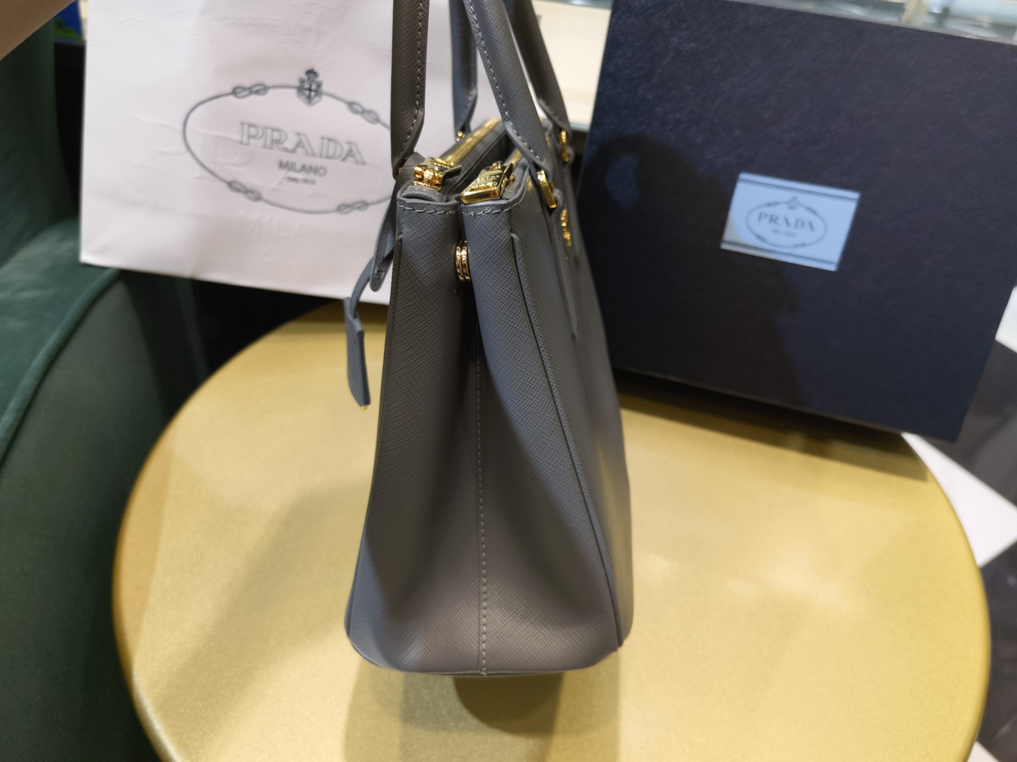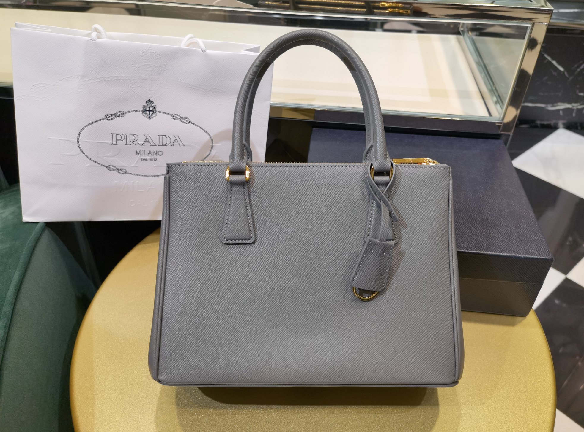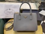 This is a replica Prada Galleria 1BA863 medium leather bag. ,Leather handles,Detachable, adjustable leather shoulder strap. Max. length: 120 cm – Min. length: 110 cm – Max. drop length: 60 cm – Min. drop length: 55 cm,Removable leather key ring,External zipper pockets,Metal hardware,Leather triangle with metal lettering logo on the front,Snap closure on the sides,Logo-print nylon lining with two pockets, including one with zipper,With purse feet,Height: 19.5cm,Width: 28cm,Length: 12cm