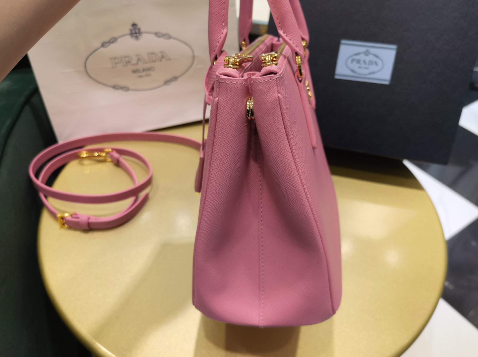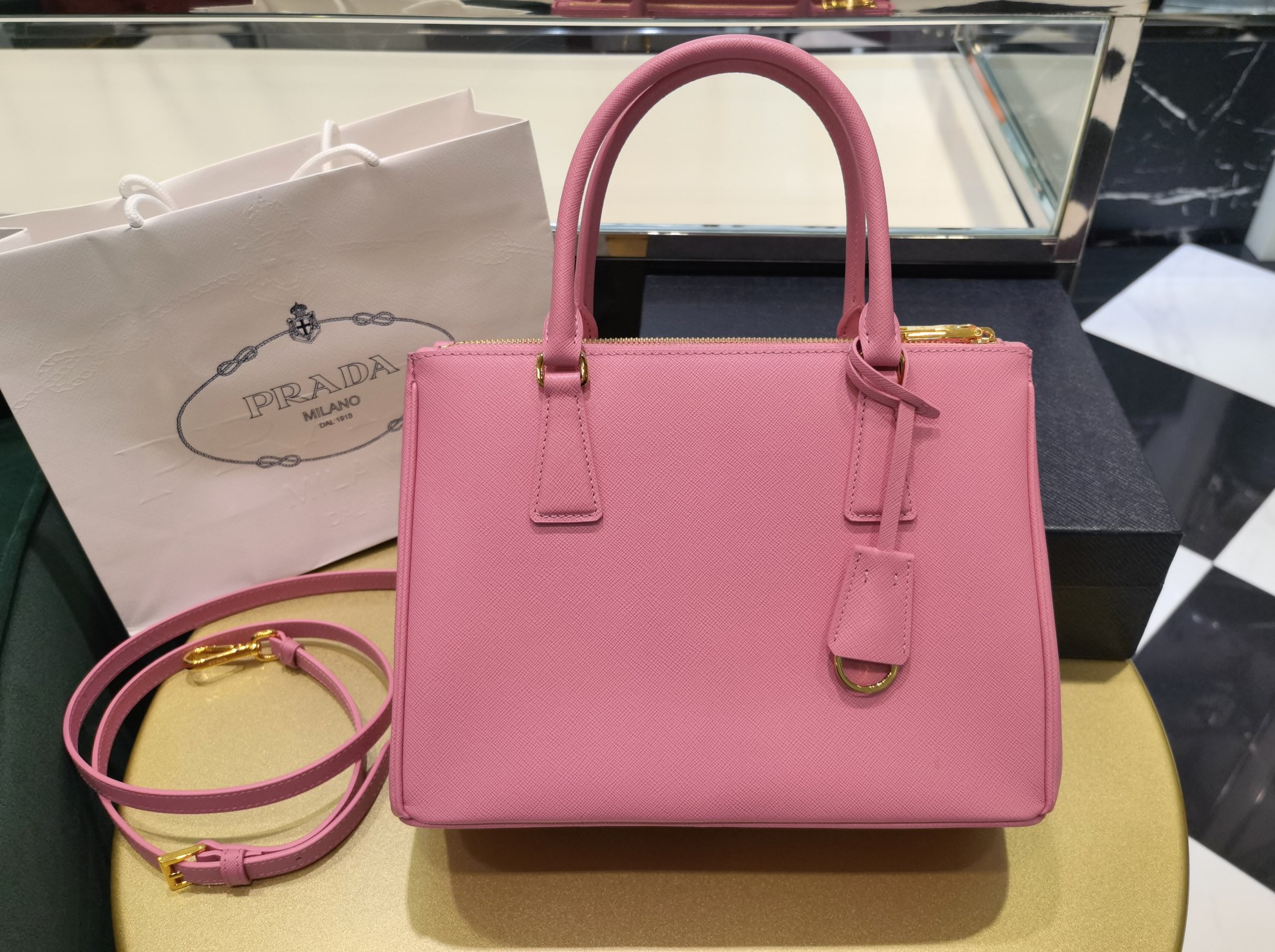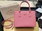 This is a replica Prada Galleria 1BA863 medium leather bag. ,Leather handles,Detachable, adjustable leather shoulder strap. Max. length: 120 cm – Min. length: 110 cm – Max. drop length: 60 cm – Min. drop length: 55 cm,Removable leather key ring,External zipper pockets,Metal hardware,Leather triangle with metal lettering logo on the front,Snap closure on the sides,Logo-print nylon lining with two pockets, including one with zipper,With purse feet,Height: 19.5cm,Width: 28cm,Length: 12cm